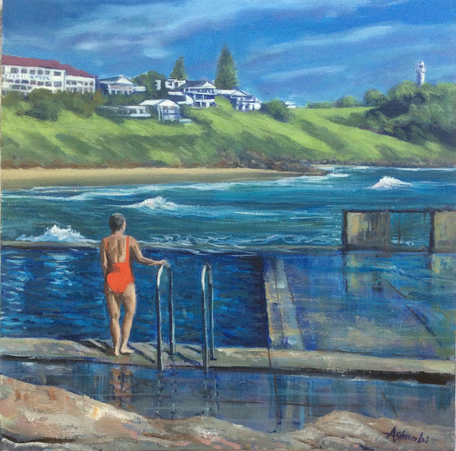 I often see people relaxing by the ocean pool at Yamba and I was inspired to paint this lovely lady in her vibrant red swimsuit.