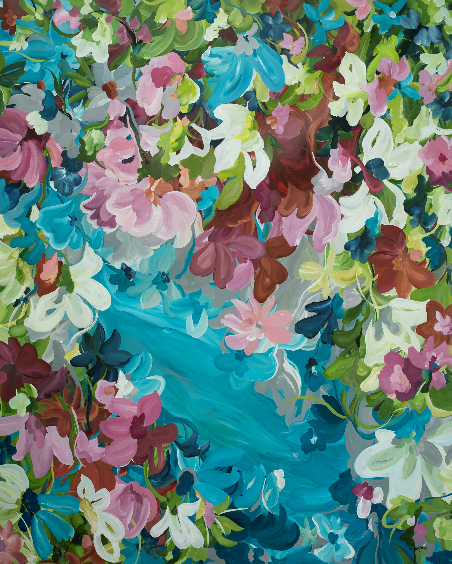 There’s a feeling of sanctuary here. The river becomes a place of pause and reflection, while the surrounding blooms feel protective, almost celebratory – nature holding space for calm, renewal, and emotional release. The painting balances energy and peace, vibrancy and rest, making it both uplifting and grounding.