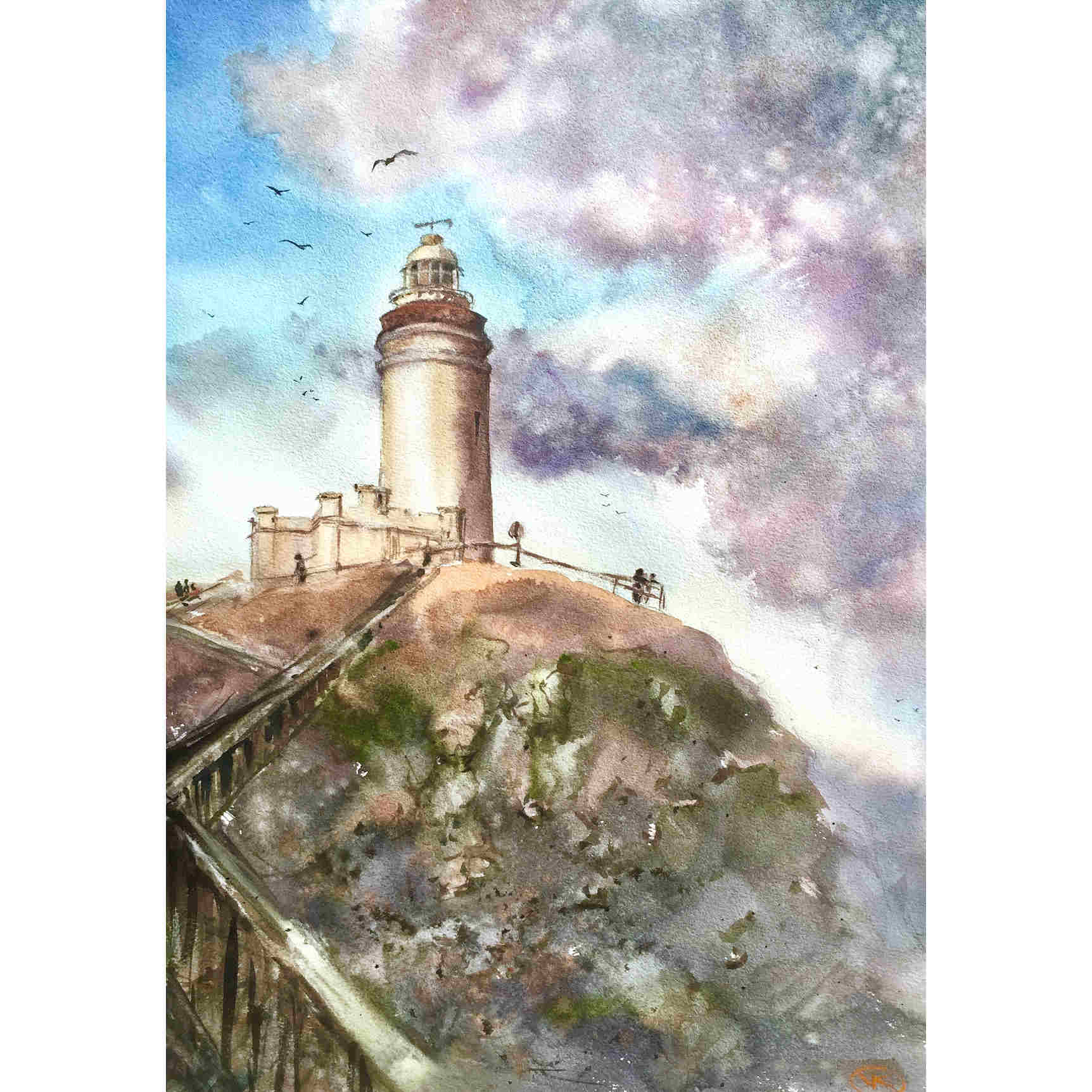 Byron Bay Lighthouse by Violetta Kurbanova – Australia, ocean, harbour, boat, beach, clouds, sunset, watercolour painting.