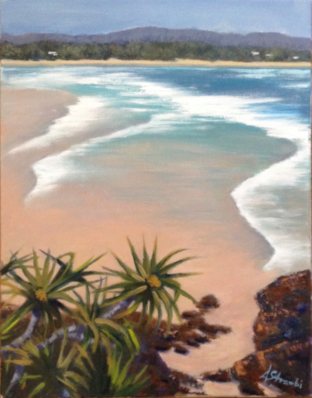 Oil on canvas looking along the beach at Bryon Bay with pandanus in the foreground.The location is one of my favourite places to visit, with its relaxing vibe and beautiful beaches.