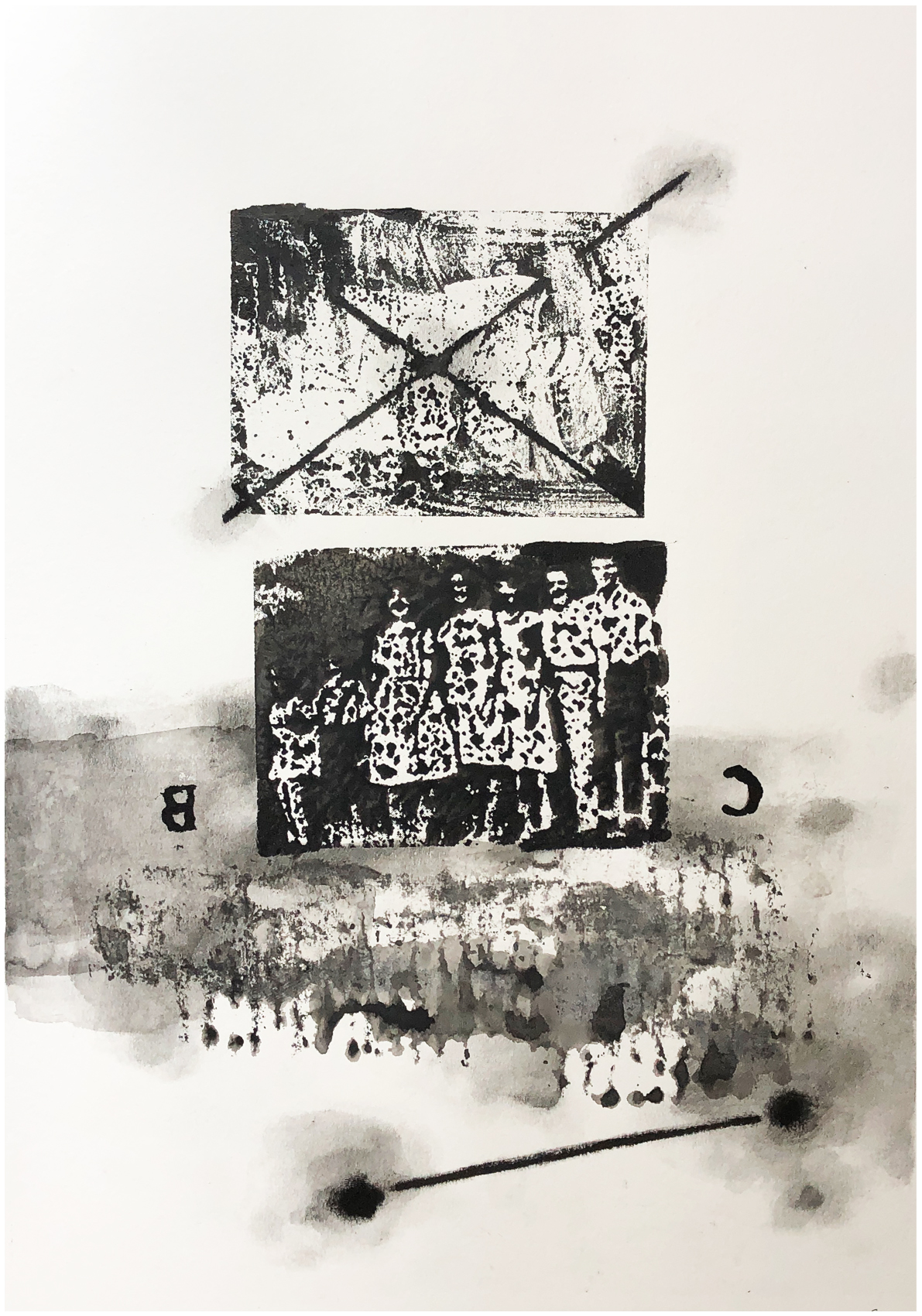 C B Backwards is an original artwork that is created using vintage printing plates along with home made printing forms [ relief type] that have been hand printed. Keeping the work purely black & white for subtle contrasts between elements. This piece is about breaking away from whats expected of you and doing what pleases you, for yourself. A mixed media work with the use of inks, acrylic paint, oil sticks and various pencils.