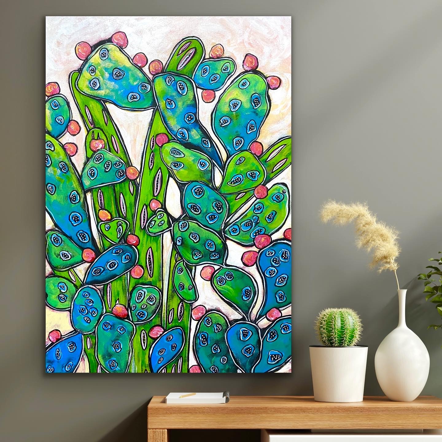 An original, modern, stylised painting inspired by green prickly pear cactus and their unique shapes, random fleshy form and pink fruit. They grow where, often times, nothing else will, adding a coolness of colour to the landscape.