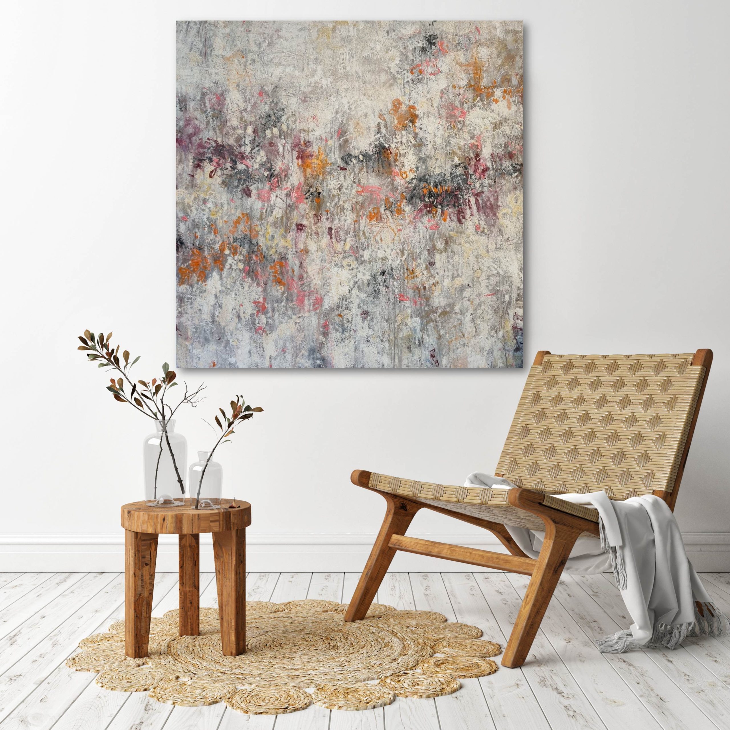 This painting is finished with a modern soft satin protective finish and matte white edges. It’s feel within a room is dynamic and decorative, yet holds a grounding and calming effect, sure to make an appealing feature, at home equally in a domestic interior or corporate space.