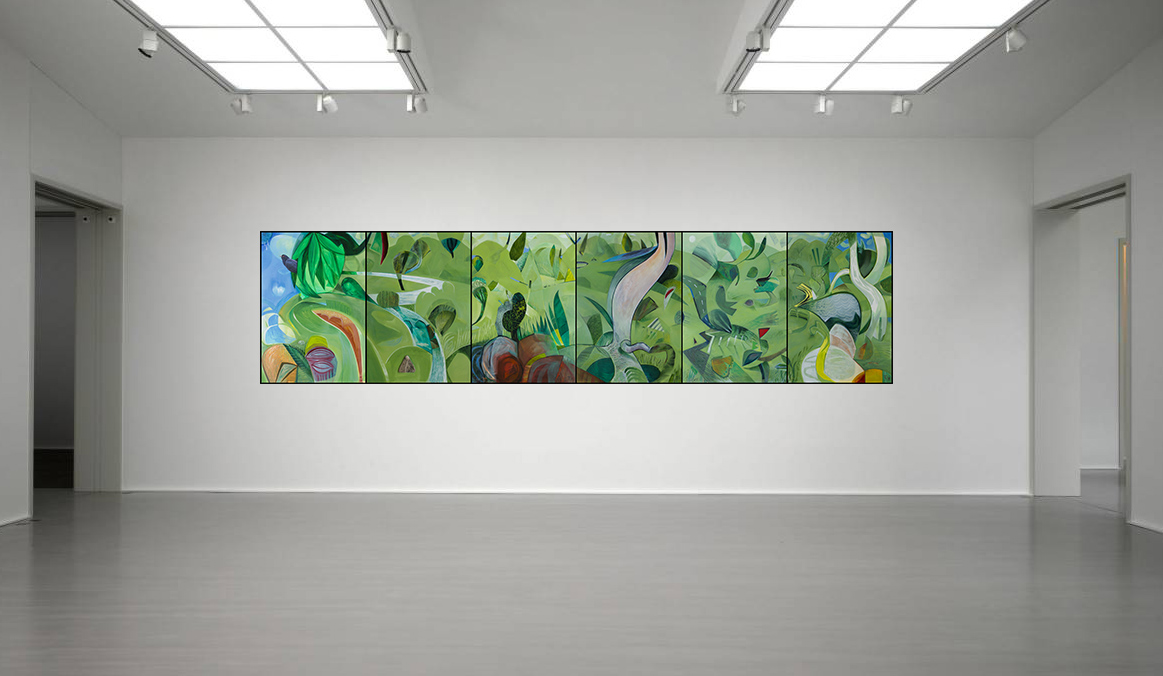 Protected with Golden UVLS varnish. Total width 5.6m – each panel 122cm x 92cm x 2cm. Painted January 2018.