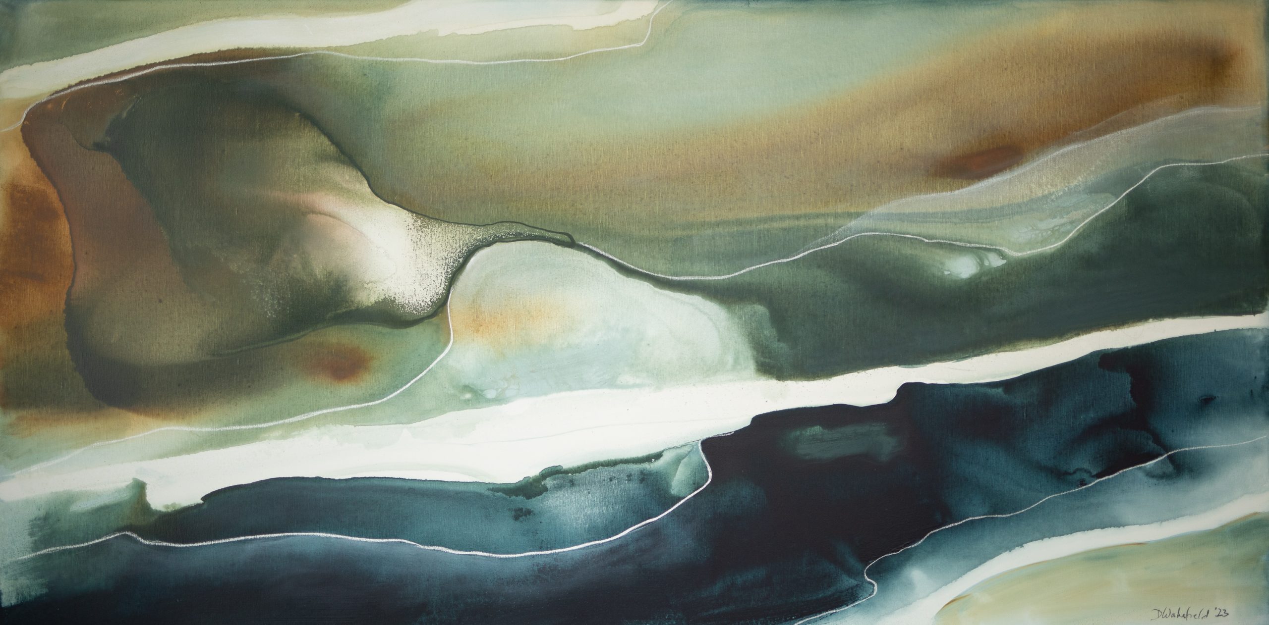 Callisto by Dinah Wakefield is inspired by the light, the colours and the natural beauty of the Noosa region of Australia. “What I love most about Noosa is the interplay of light. From the oceans to the clouds, to the river estuaries and the hinterland, this canvas unfolds before me every day and finds expression in my paintings”.