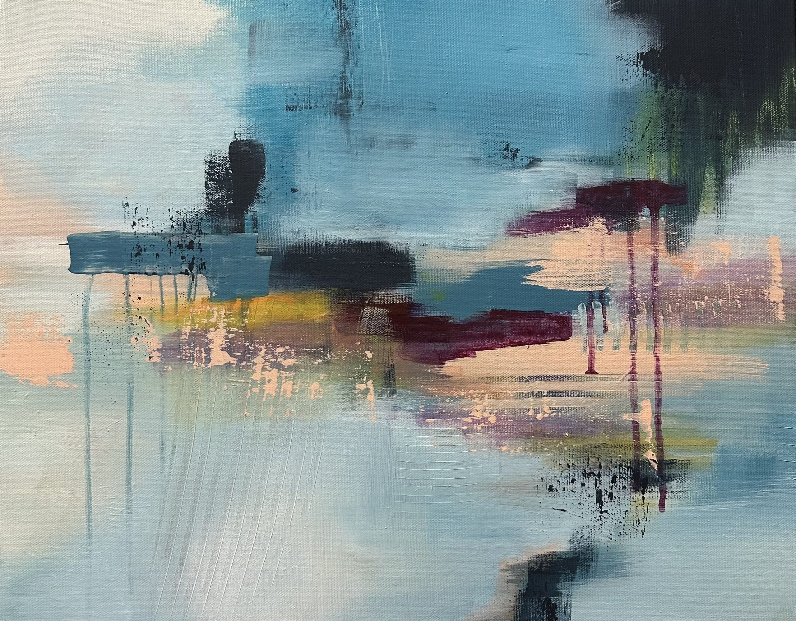 As an intuitive painter, I am very influenced by the state of my mind and usually my subconscious takes over and I don’t know what my paintings are about until I reflect after I’ve finished. In this case I attended a very inspiring talk and part of the conversation was about the fact that water can hold emotions and how water can calm the spirit.