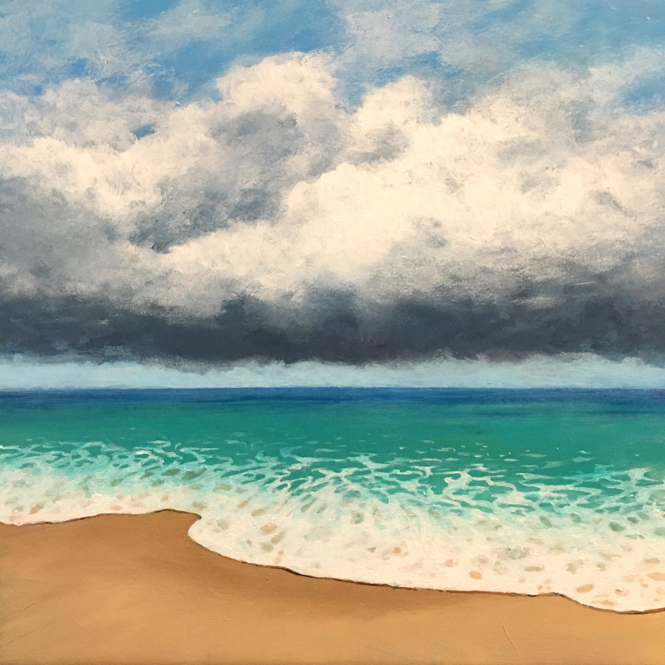 Storm clouds rolling in agains a blue sky and over a calm shoreline. I’m always inspired by the colours of nature.