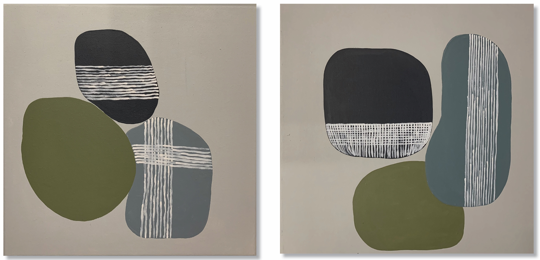 Calm II – Â diptych (2 x canvas) – Original acrylic paintings by Kim Rees. Abstract with a 60’s retro chic vibe to add some calm to your space.