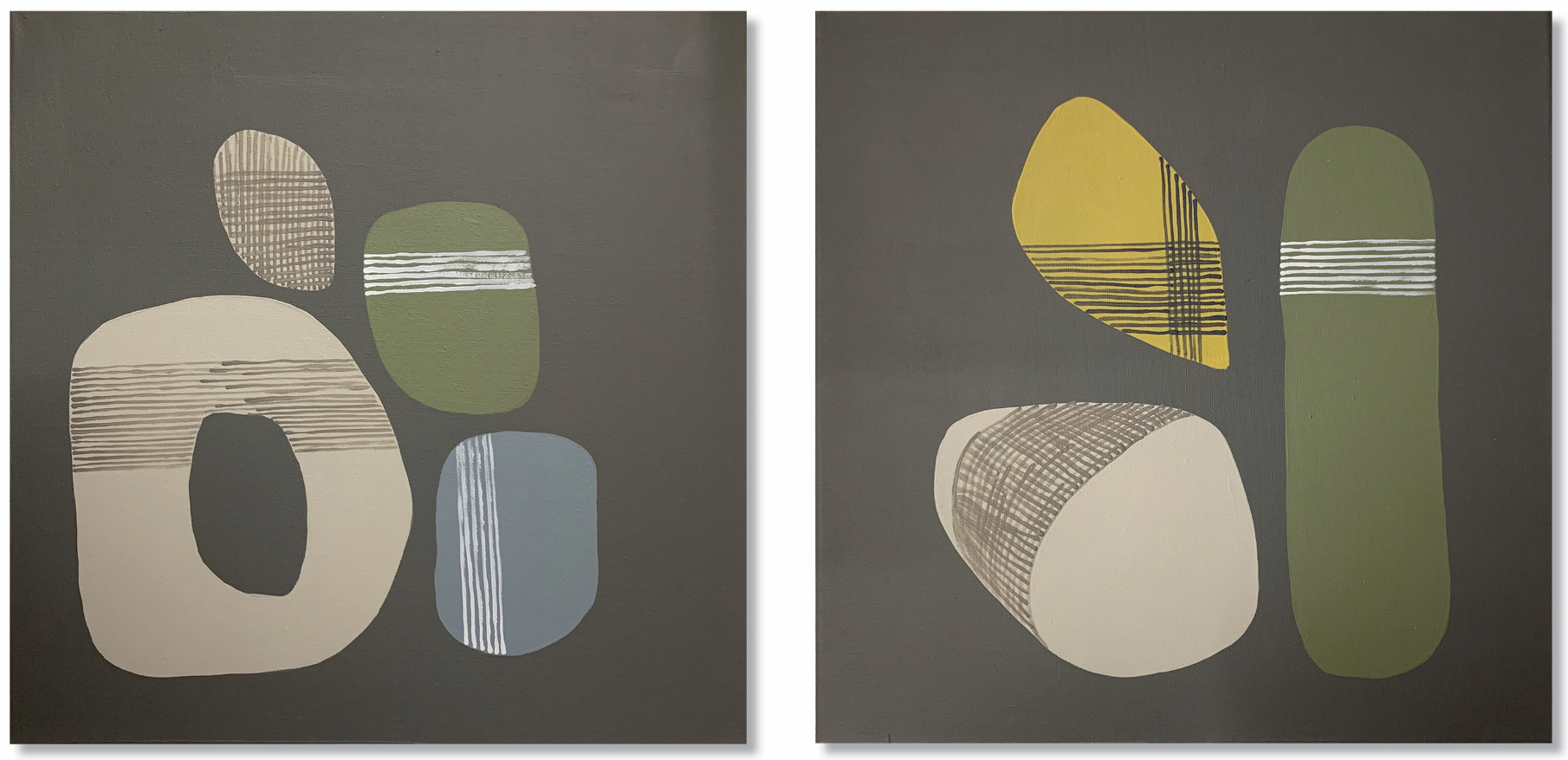 Calm III – Â diptych (2 x canvas) – Original acrylic paintings by Kim Rees. Abstract with a 60’s retro chic vibe to add some calm to your space.