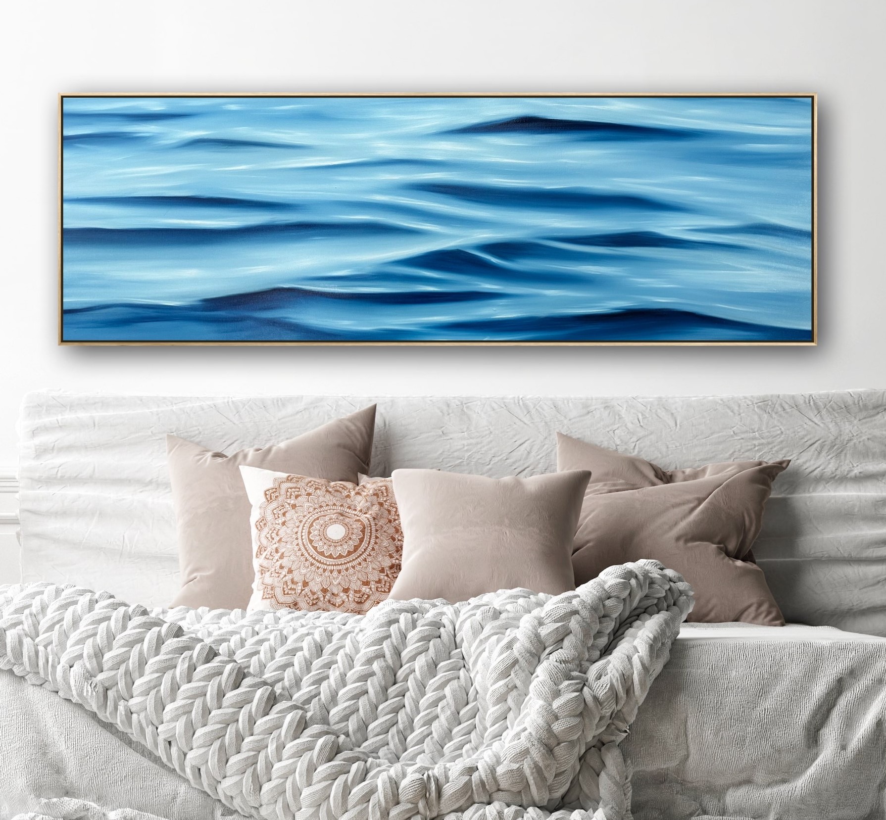 This extra large seascape is combines botha  realistic and an abstract feel without overempowering a room.