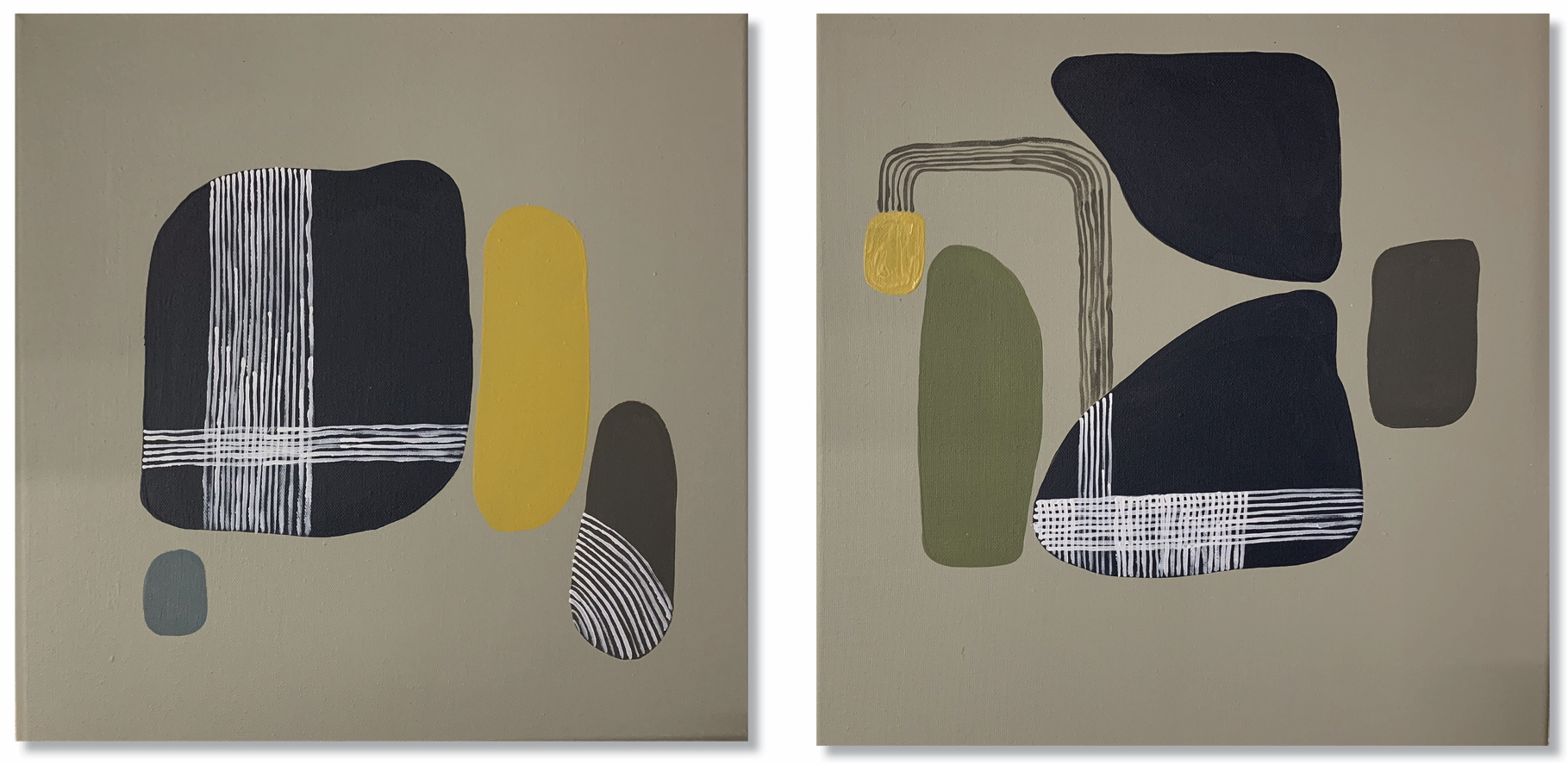 Calm VÂ – Â diptych (2 x canvas) – Original acrylic paintings by Kim Rees. Abstract with a 60’s retro chic vibe to add some calm to your space.