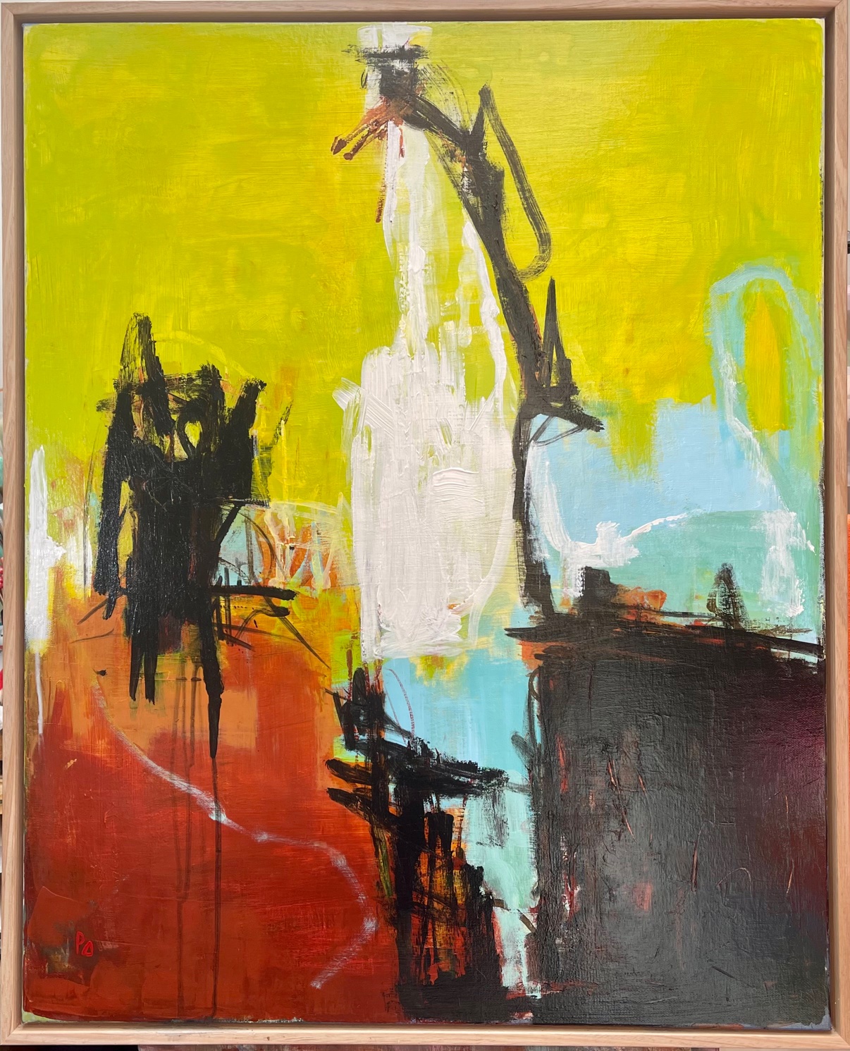 Calypso by Paola Ditel – Abstract in cool colours with bold black marks creating a rhythm and movement. Would suit modern settings. Oak coloured framed surround painting. Sealed in gloss vanish. Ready to hang.