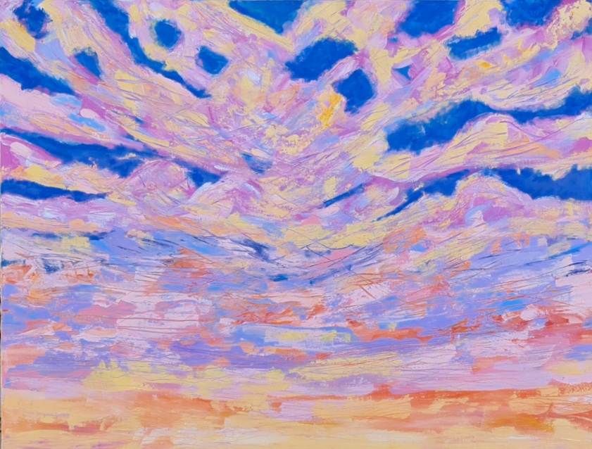 A large expressionistic response to all the beautiful afternoon skies we seem to be having this year. Somehow seeing a beautiful sky reminds me of how lucky we all are to be alive and a little sad for the people who we have lost. My children and I refer to these as “Angel Skies”.