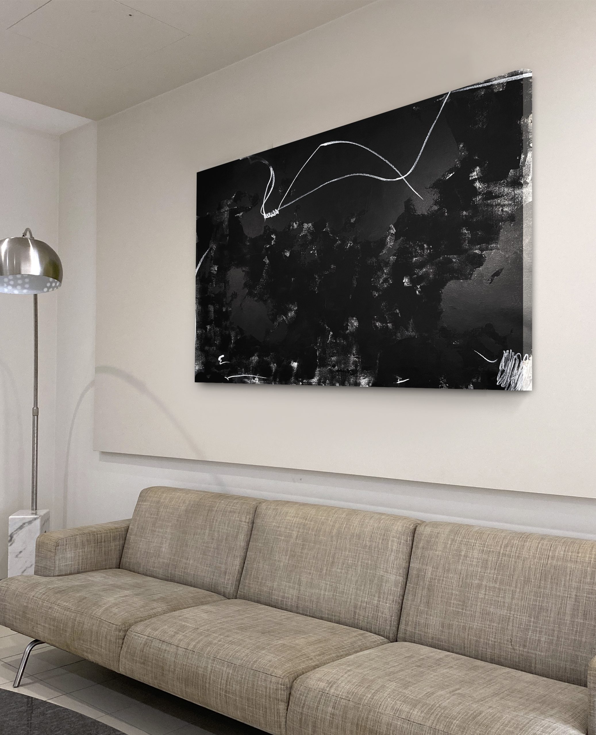 It’s intriguing expressionist mark making combined with its restful and calm neutral, black and white monochromatic palette (with just a hint of warm underpainting) is the perfect statement piece for a large space. Shown in some of the images is the effect directional light plays on the surface of this artwork making it shimmer in places and almost seems the colour of rich dark chocolate brown at times.