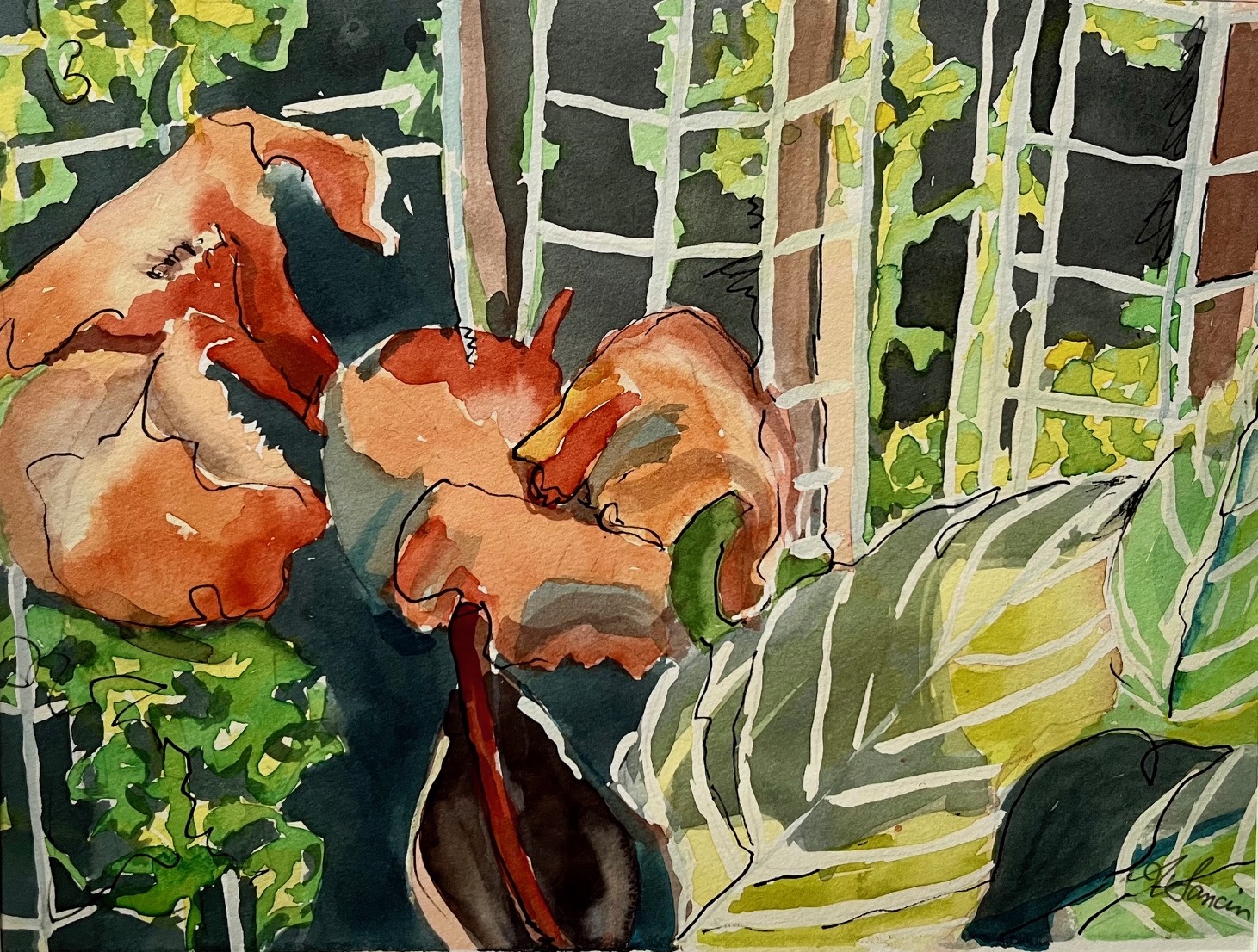 Canna Lilies by Ambra Sancin – Vibrant tangerine-coloured Cannas pop in my garden against a dark grid background.