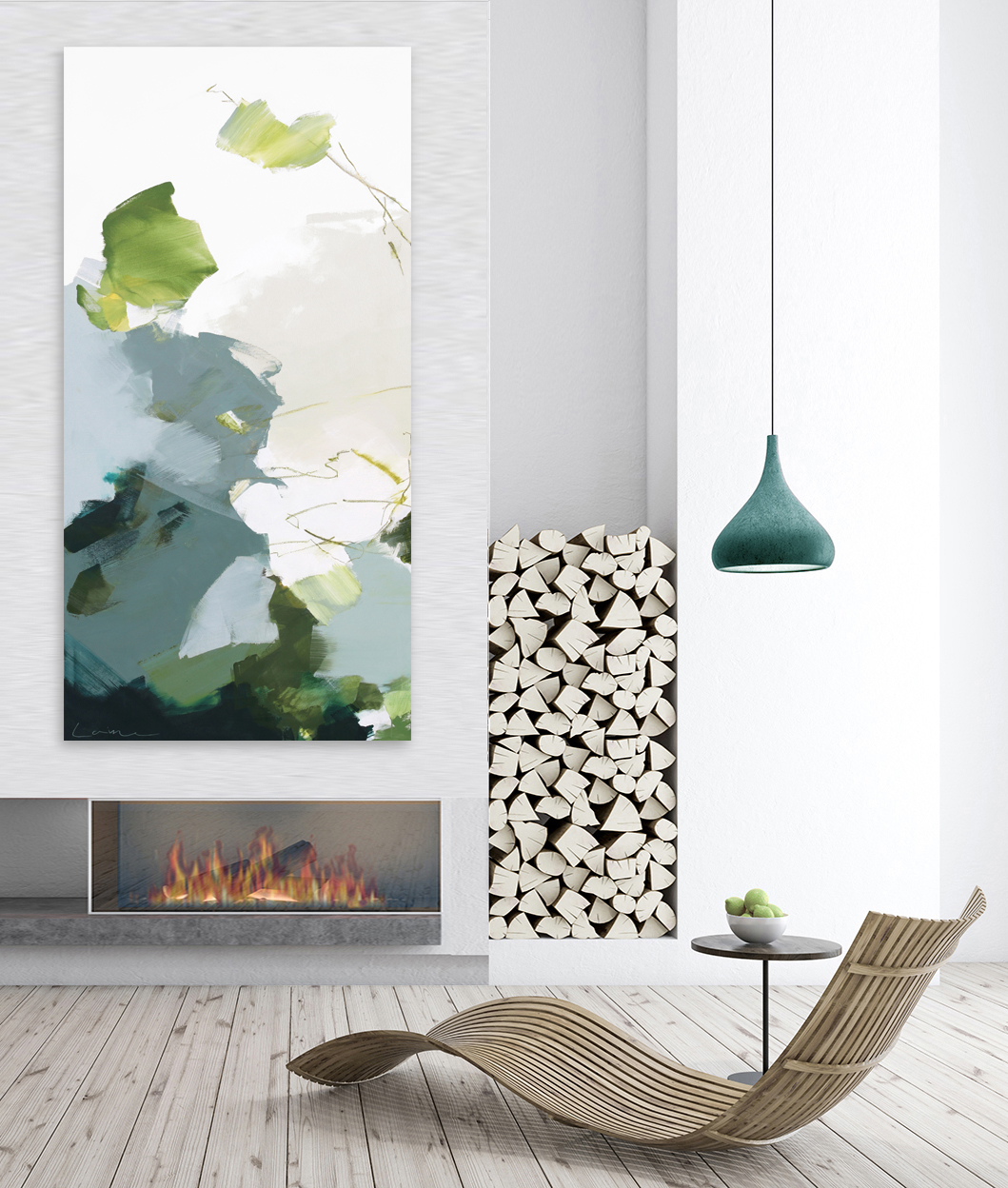 Canopy Dance can be hung vertically or horizontally and is a combination of greens, blues, greys and mustard olives. She is painted on quality 12oz canvas stretched onto a custom timber frame with painted 3.8cm sides, so she’s ready to hang.