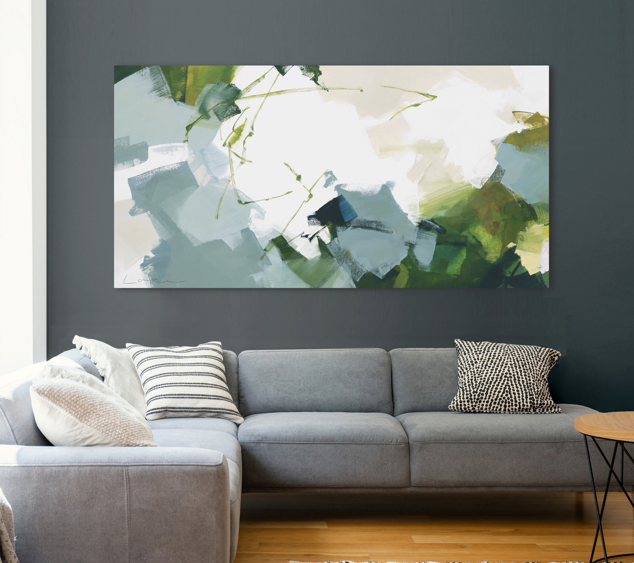 Canopy Vista can be hung vertically or horizontally and is a combination of greens, blues, greys and mustard olives. She is painted on 12oz canvas stretched onto a quality custom made frame with painted 3.8cm sides, so she’s ready to hang. Please note there is no external floating frame included.