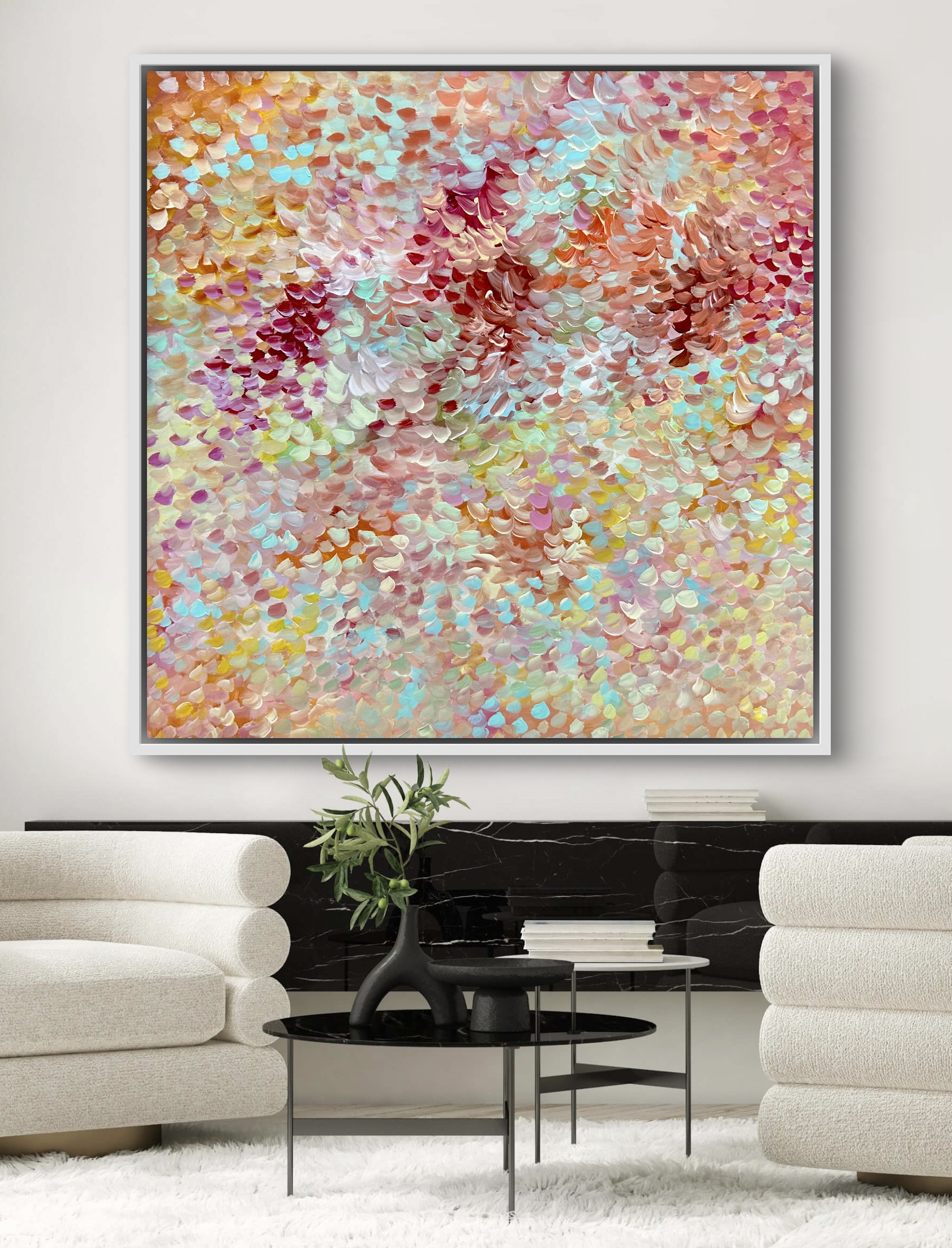 In this acrylic piece, I poured my heart into capturing the gentle dance of light and petals, blending abstract and impressionist touches. Every brushstroke breathes warmth and tender energy, inviting calm and joy. Imagine this blossoming vibrancy elevating your space, filling it with serene beauty and soft whispers of nature’s endless bloom. This painting does not come with an external frame.The painting is signed and dated at the back and comes with a certificate of Authenticity.