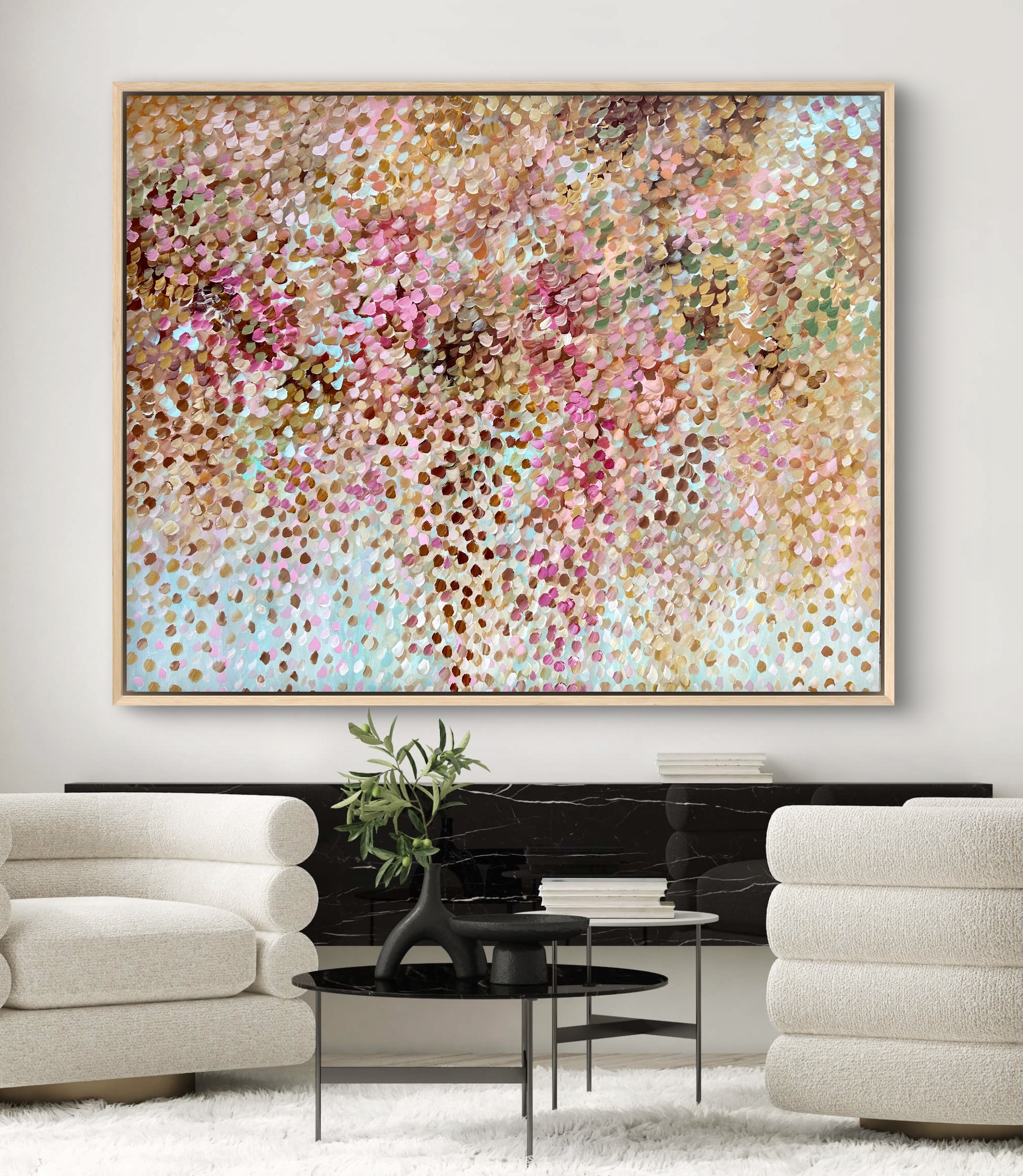 A painting with warm and cool colours of flowers and petals flying in the wind creating weeping over the landscape with lots of layers of acrylic paint. Petals weeping over the landscape creating so much movement and rhythms . A very peaceful and tranquil painting with so much depth. The painting does not come with an external frame.The painting is signed and dated at the back and comes with a certificate of Authenticity.