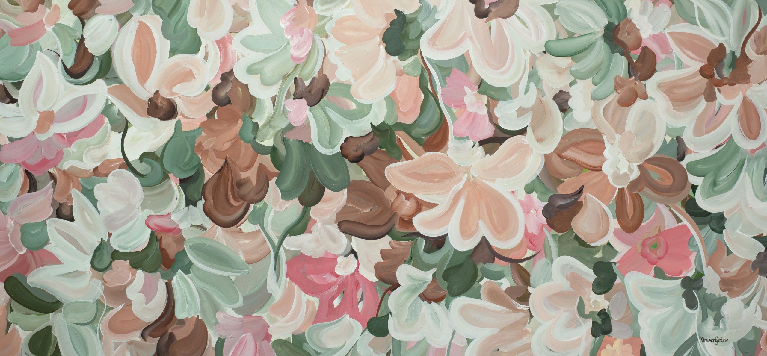 The expressive brushwork feels instinctive and tender, as though the painting was formed in a single breath – each stroke holding a sense of movement and grace. Floral forms emerge without demanding definition, inviting the viewer to slow down and linger, to discover beauty not in perfection, but in softness, balance and subtle variation.