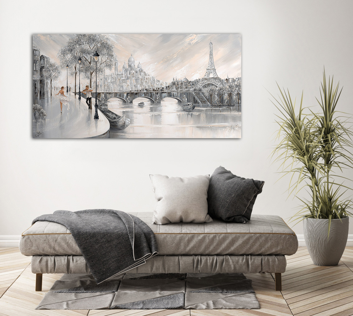 Transporting you to the heart of Paris, where timeless beauty meets modern allure. This panoramic masterpiece bathes the city in a soft, enchanting grayscale palette, while a touch of warmth in the sky adds a subtle, inviting glow.