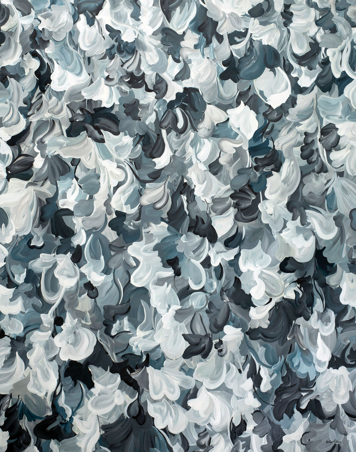 Capturing Midnight is an immersive abstract painting that evokes the quiet intensity of night in motion. Layered, gestural brushstrokes ripple across the surface in a sophisticated palette of soft whites, silvers, charcoal and deep blue-greys, creating a sense of depth and constant movement. The composition feels both atmospheric and intimate – like moonlight breaking through drifting clouds or shadows folding into one another after dark.
