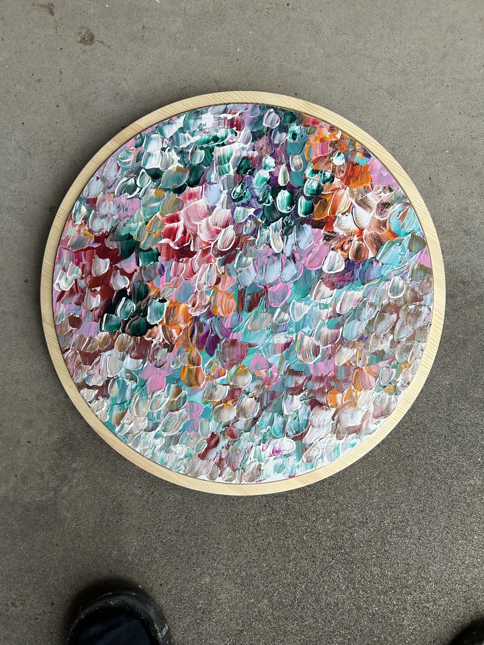 Careless Whispers by Melbourne artist Theo Papathomas is a painting with warm and cool colours of the flowers and petals flying in the wind creating this beautiful bouquet of petals in the sky with lots of layers of paint. Petals weeping over the landscape creating this veil of petals with so much movement and rhythms. Petals dancing like musical notes in the sky, painted with a pallet knife and brush to create so much texture . A very peaceful and tranquil painting with so much depth. The painting comes with an external frame.The painting is signed and dated 2023 at the back and comes with a certificate of Authenticity.