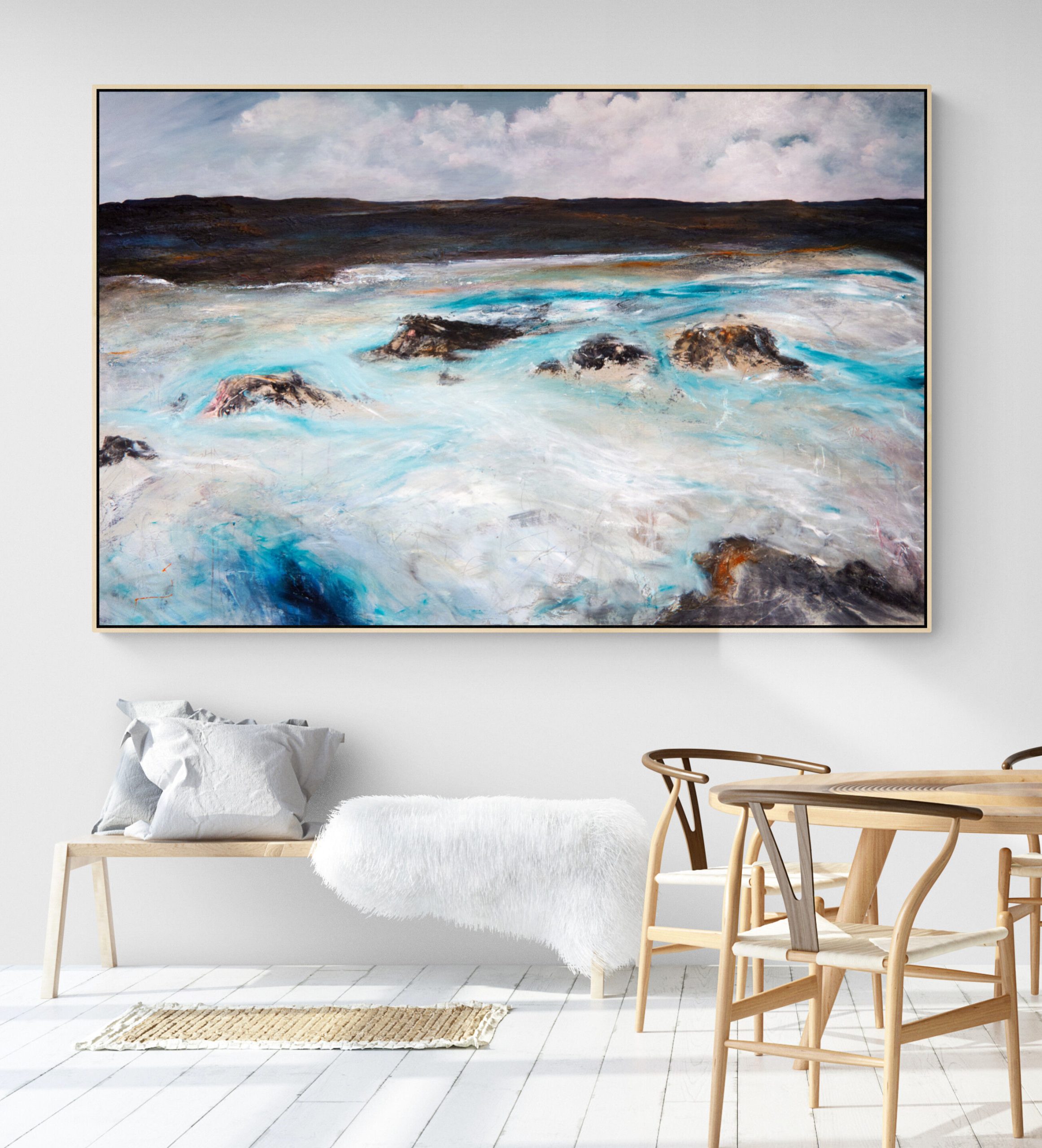 Caressed By The Ocean’s Tears by Tania Chanter  This abstract seascape painting is a dynamic portrayal of the meeting of land and sea, and the use of texture adds depth and movement to the composition.