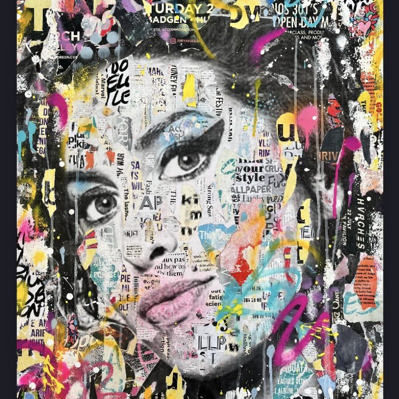 The black screen print was printed directly onto the canvas. Paint, colour and collaged paper elements were then added. Collage elements include pieces cut and torn from vintage magazines and an old destroyed record cover (Carousel). These combined with pieces taken from magazines, books, maps, brochures and pics all blend to create this one of a kind original artwork.