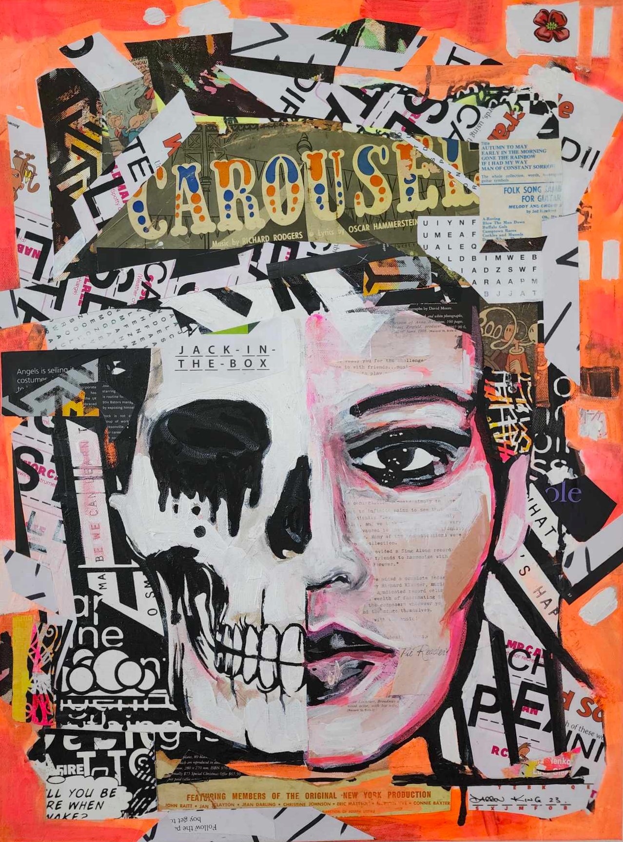 Created using screen printing (black), collage and acrylic paint, including fluoro orange.