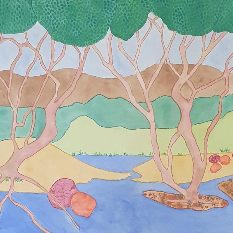 Original artwork using acrylic paints applied with trowel, hands and brush on to stretched canvas