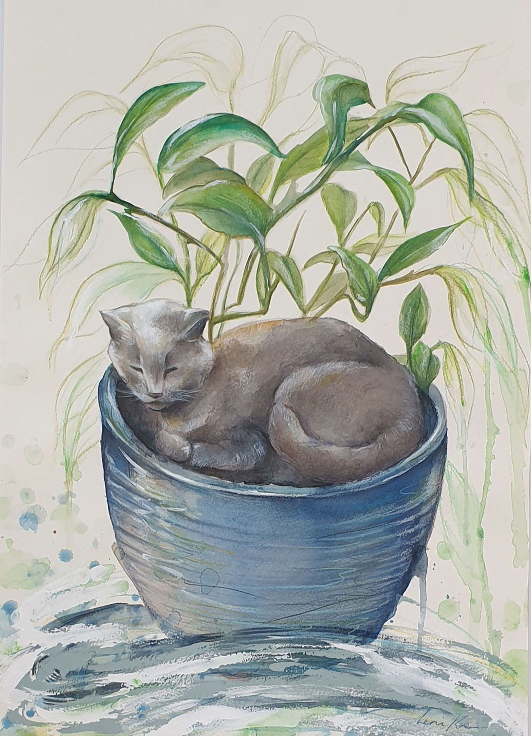 A custom pet portrait commissioned as an art gift, by Sydney artist Leni Kae. It features a cat sitting in a pot plant, and is painted in watercolour with acrylic paint and pencil highlights. Painted on A3 300gsm paper.