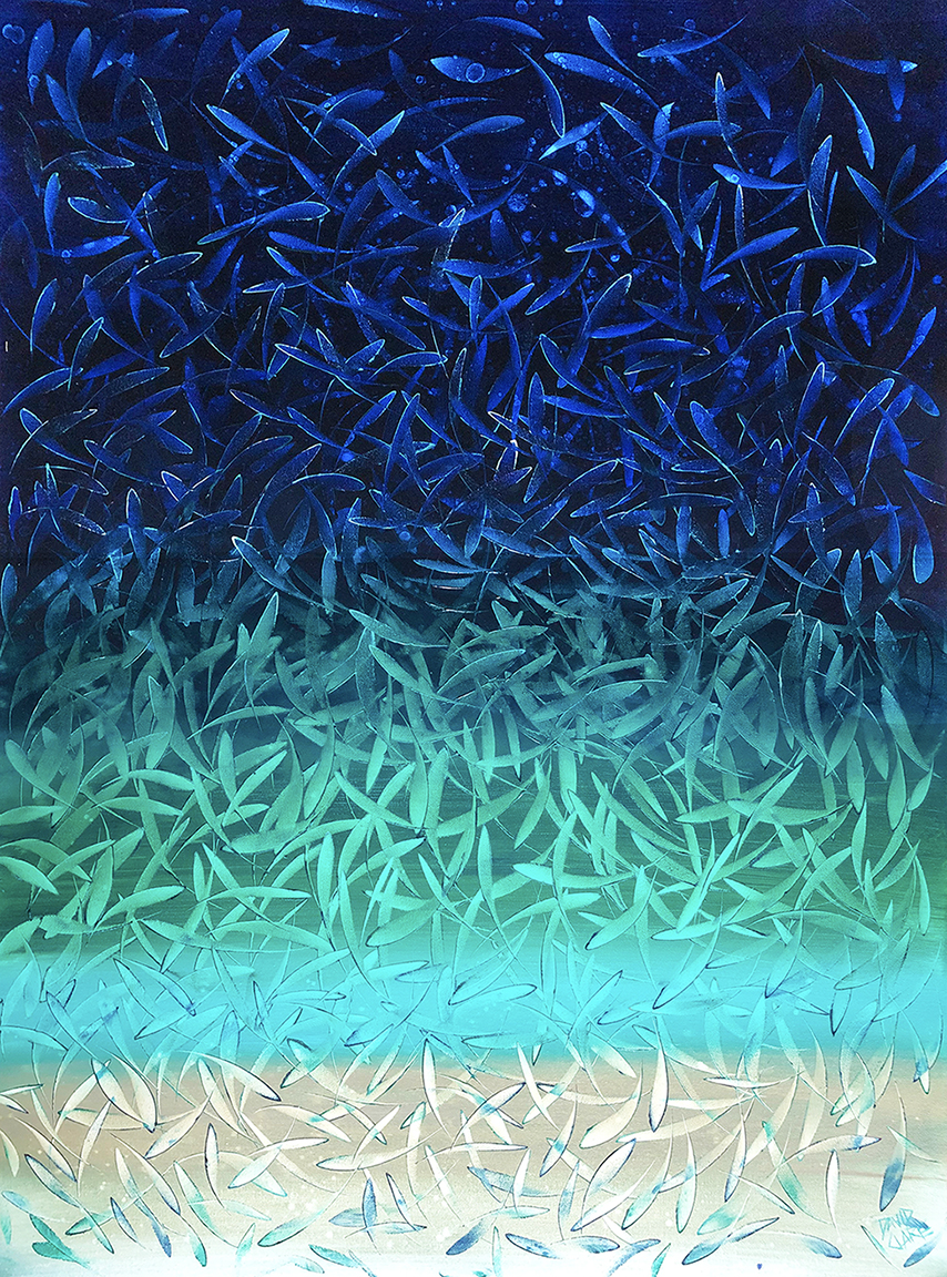 Catch Me If You Can by David Clare – A more abstract version of my fish series of paintings. I like the playful movement, and bright contrasting colours of this one. I didn’t set out to paint this one in such an abstract way, but when I saw how much fun it was, I resisted the urge to develop the fish, I just added more.