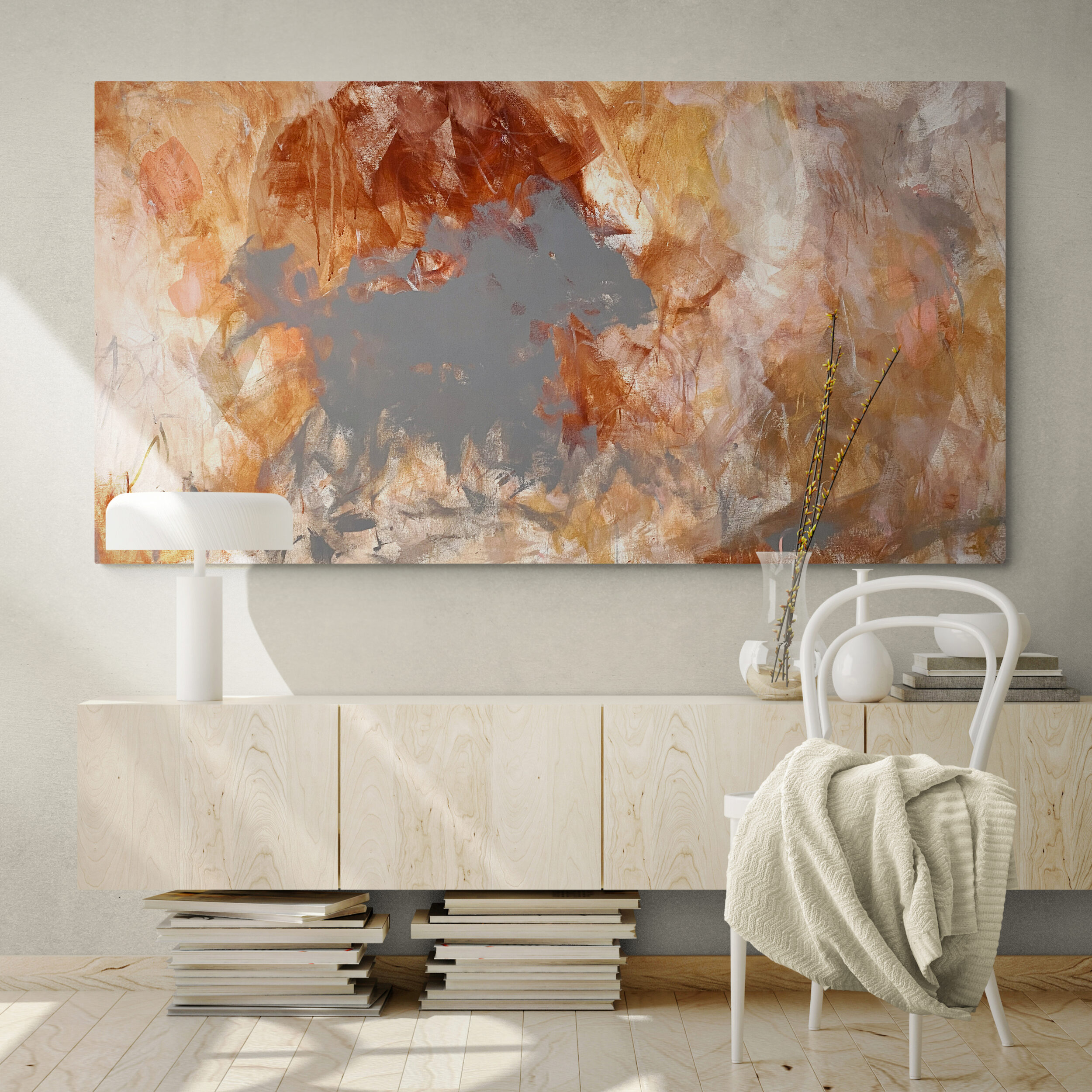 Enjoy it’s intriguing expressionist mark making combined with its restful and calm neutral palette with pops of silver, grey and warm orange terra cotta, pink and ochre lends itself as a perfect statement piece for any large space.