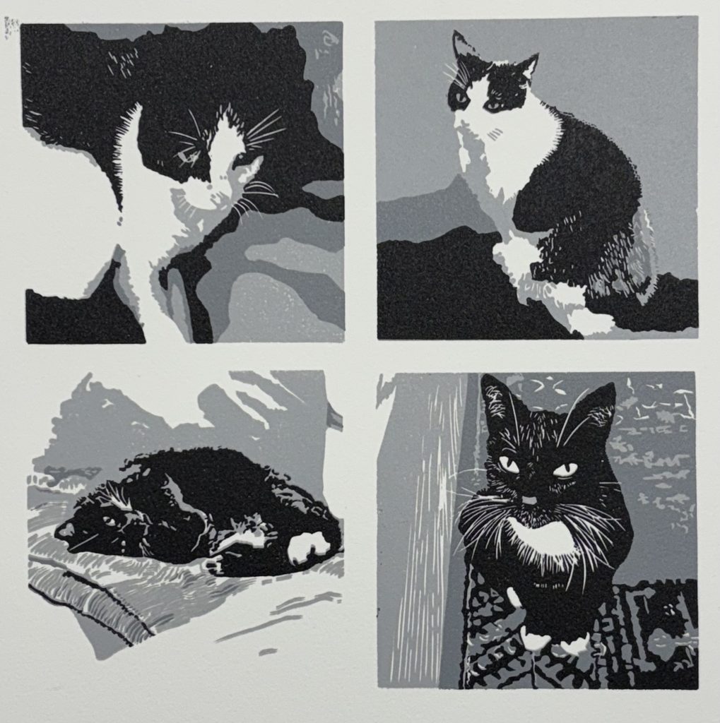 Cats, Cats, Cats! by Sara Valentino, is a limited edition reduction lino print of only 10. This is a montage of different cat’ stages’: sleep, play, impatience and demands!! The images are based on our own family members….but they really could be everyone’s precious furry friends. These have been created using archival inks and paper.