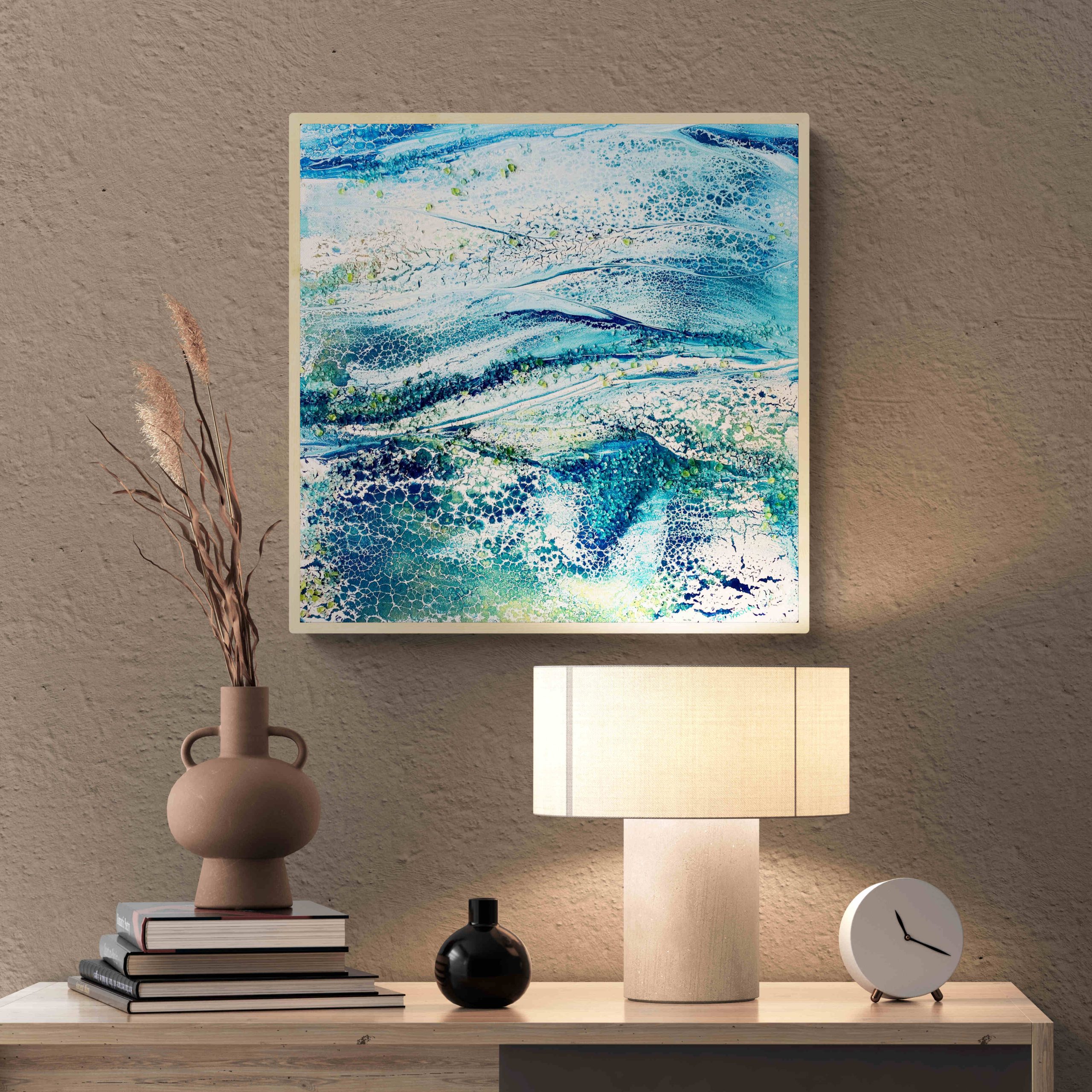 Depending on where you live, the ocean is different not only in looks but in habitat. Waters vary in temperature and so attract different types of marine life and ocean flora. Living by the Bay in Melbourne, I am witness to the ocean changing from a calm “Mill Pond” to a raging surf beach. This particular piece is a reflection of our southern waters during a Winter storm. The salty waters churning and frothing, creating huge swells in the ocean. A wonderful site from the safety of the stable shoreline.