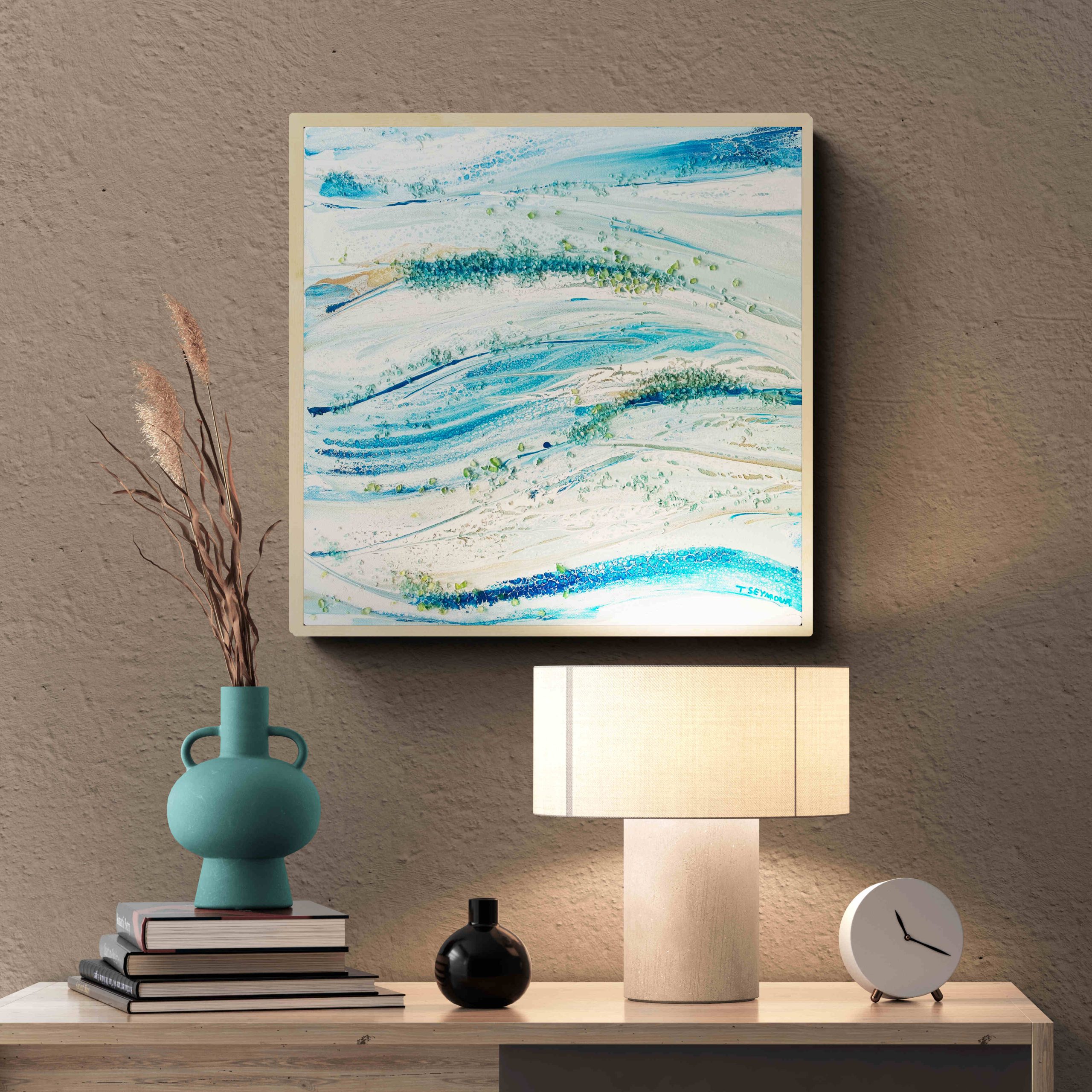 Depending on where you live, the ocean is different not only in looks but in habitat. Waters vary in temperature and so attract different types of marine life and ocean flora. Living by the Bay in Melbourne, I am witness to the ocean changing from a calm “Mill Pond” to a raging surf beach. This particular piece is a reflection of our southernsIndian Ocean waters during a storm. The salty waters churning and frothing, creating huge swells in the ocean. A wonderful site from the safety of the stable shoreline.