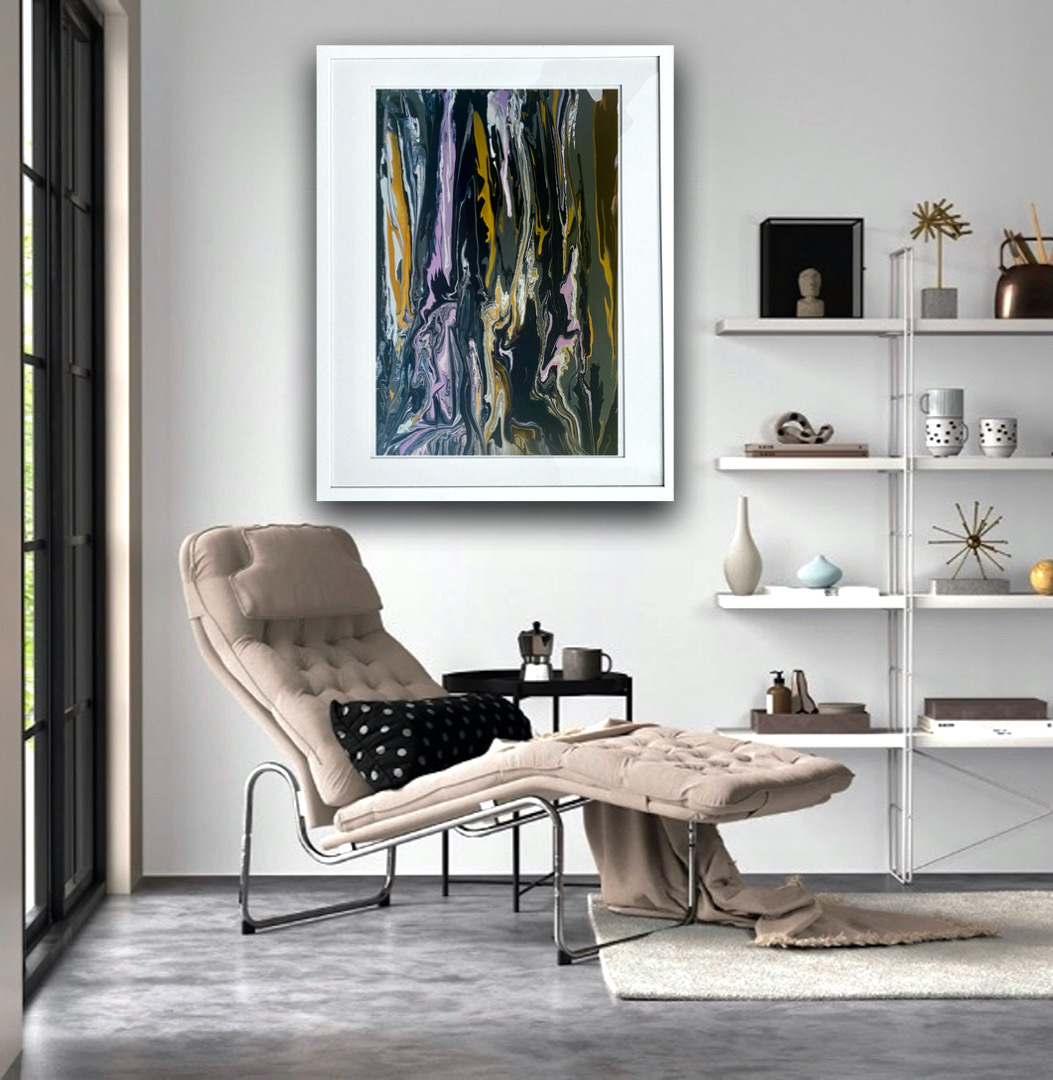 This is a unique, one-of-a-kind flowing artwork. Truly a statement and conversation starter. It has been lovingly created using multiple emerging colours of ochre, lavender and soft greys using techniques to develop the beautiful flowing surface on smooth durable Yupo paper, allowing interaction of the artist grade acrylic inks and polymer paints and to create emerging layers and depth