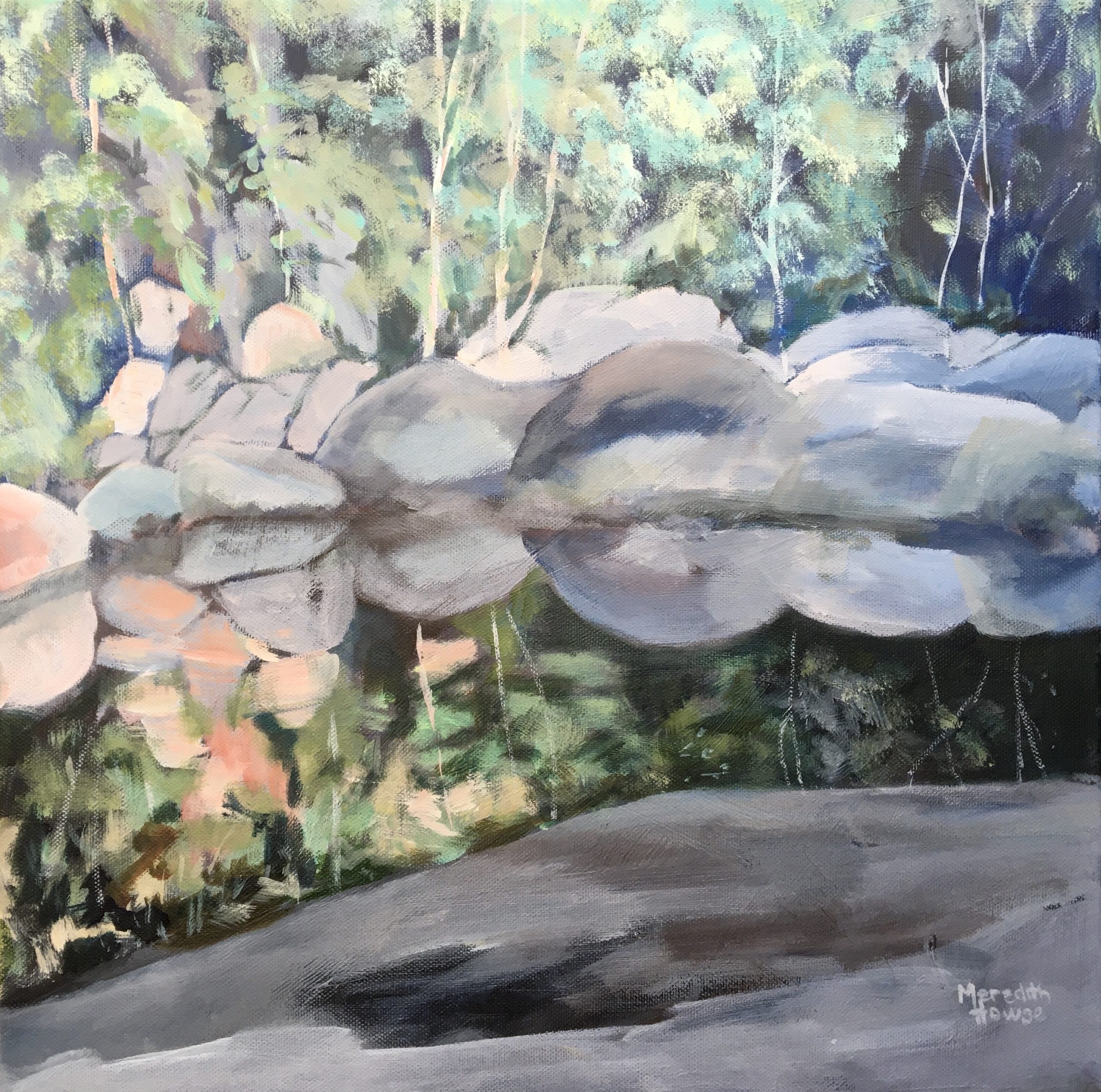 Cedar Creek by Meredith Howse, captures the beauty of a rock pool nestled in the scenic locale of Samford, Brisbane. This artwork presents a picturesque scene that embodies the respite offered by natural landscape. Howse transports viewers to this tranquil oasis, where reflections play on the water’s surface.