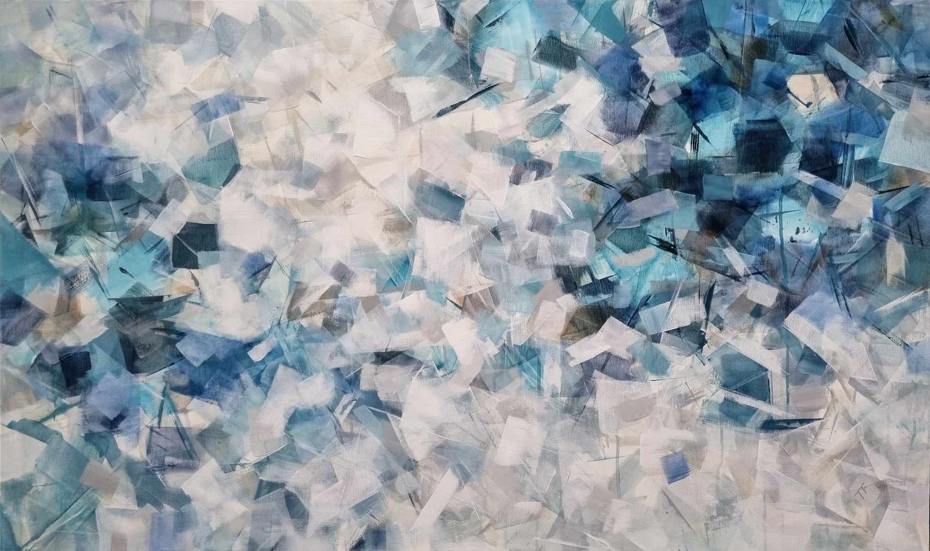 The work suggests gentle motion—like fog dissolving over water or light filtering through ice—offering a meditative presence and subtle sense of depth. Its scale and palette make it an elegant statement piece for modern interiors, whether calm and minimal or layered and textural.