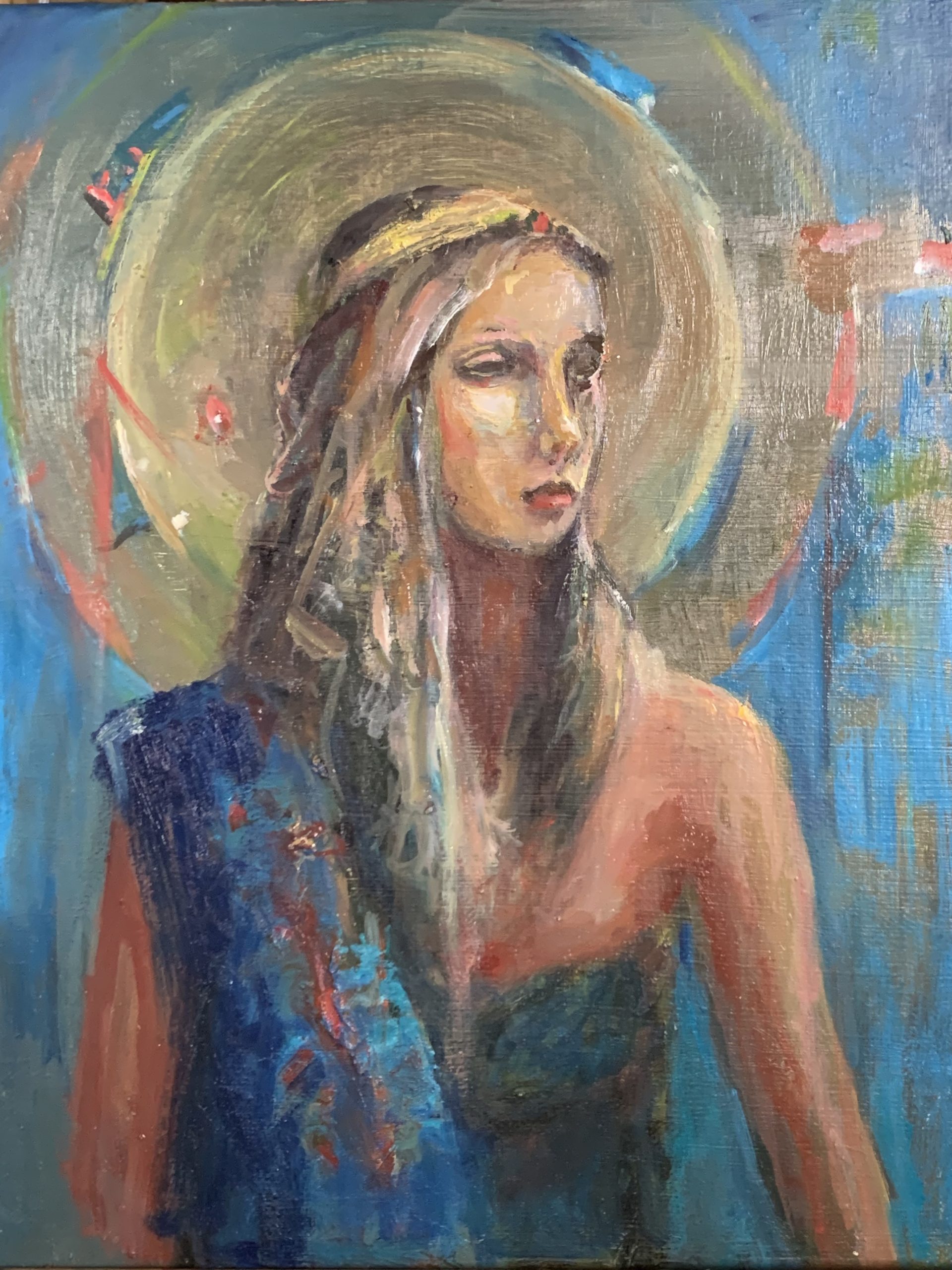 A small portrait of an imagined woman. She is an exploration of the enigmatic myth of the strong and forgotten woman. I can’t quite tell if she is now or then, in time. “Probably both,” she seems to imply. Who ever she is, she is a mystery. A mysterious woman looks to her left, she has a pastel aura and is placed in an unknown location. She is also unknown, or forgotten. Dressed in blue with a small crown or head band, we cannot place her in the now, or then.