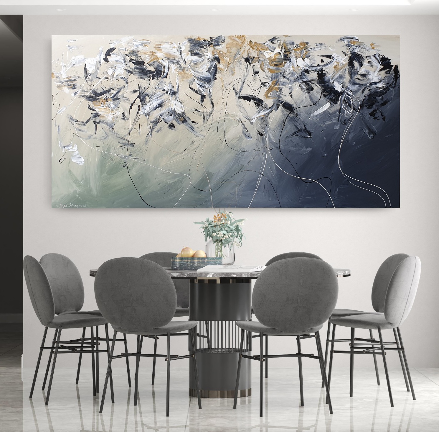 I view painting as sheer passion and feeling. Through my process I don’t seek to depict a set idea or subject, but instead I let scenes and dynamic movement emerge organically.