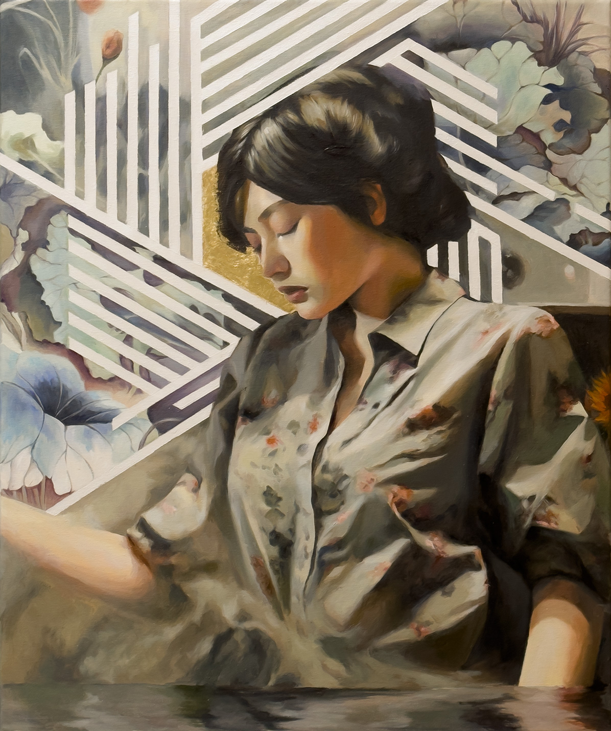 “Changes” by Chris Le is a captivating oil painting that beautifully encapsulates a moment of introspection and transformation. The central figure, a young woman with her eyes closed, evokes a sense of calm and contemplation. The intricate background features geometric patterns and delicate floral motifs, symbolising the interplay between structure and nature, change and constancy. The soft hues of her attire blend seamlessly with the surrounding elements, creating a harmonious and serene composition. The elegant gold frame further enhances the painting’s sophistication, making it a standout piece.