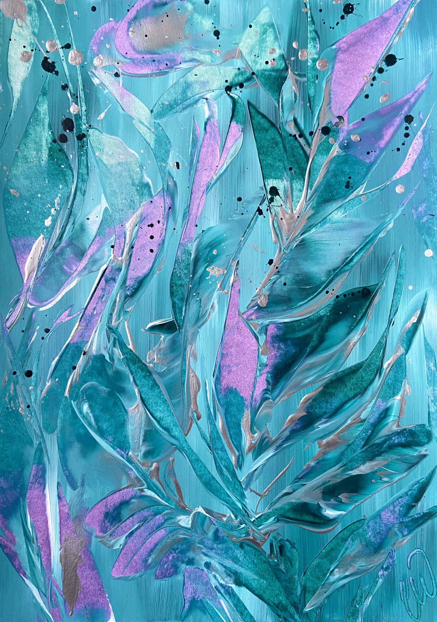 Chasing Light by Carrie Welsh is an abstract botanical piece that has lots of captured movement and silver metallic accents. Some images show what this piece looks like framed. Frames not included. 29.7 x 42 cm (A3 size) Acrylic on paper. Requires framing.
