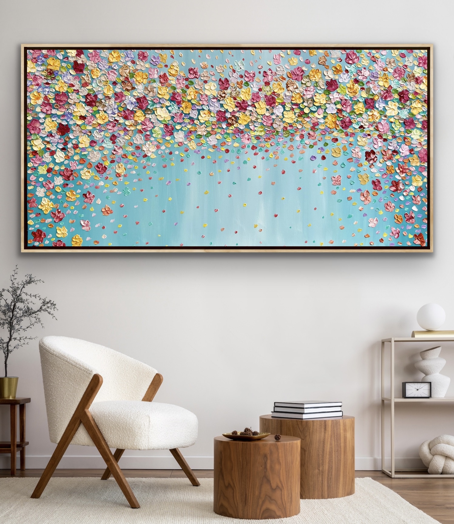Chasing Rainbows by Theo Papathomas  a painting with warm and cool colours of the flowers and petals flying in the wind creating this beautiful rainbow of petals over the sky with lots of layers of paint. Petals weeping over the landscape creating this veil of petals with so much movement and rhythms. Petals dancing like musical notes over the sky creating a rainbow of colours painted with a pallet knife to create so much texture . A very peaceful and tranquil painting with so much depth. The painting does not come with an external frame.The painting is signed and dated at the back and comes with a certificate of Authenticity.