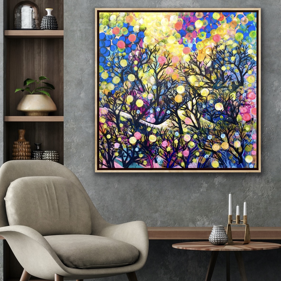 An original, abstract landscape inspired by the brilliance of strong sunlight floating to a forest floor…..shining bubbles of yellows and deep sky blues, glistening and capturing the light.