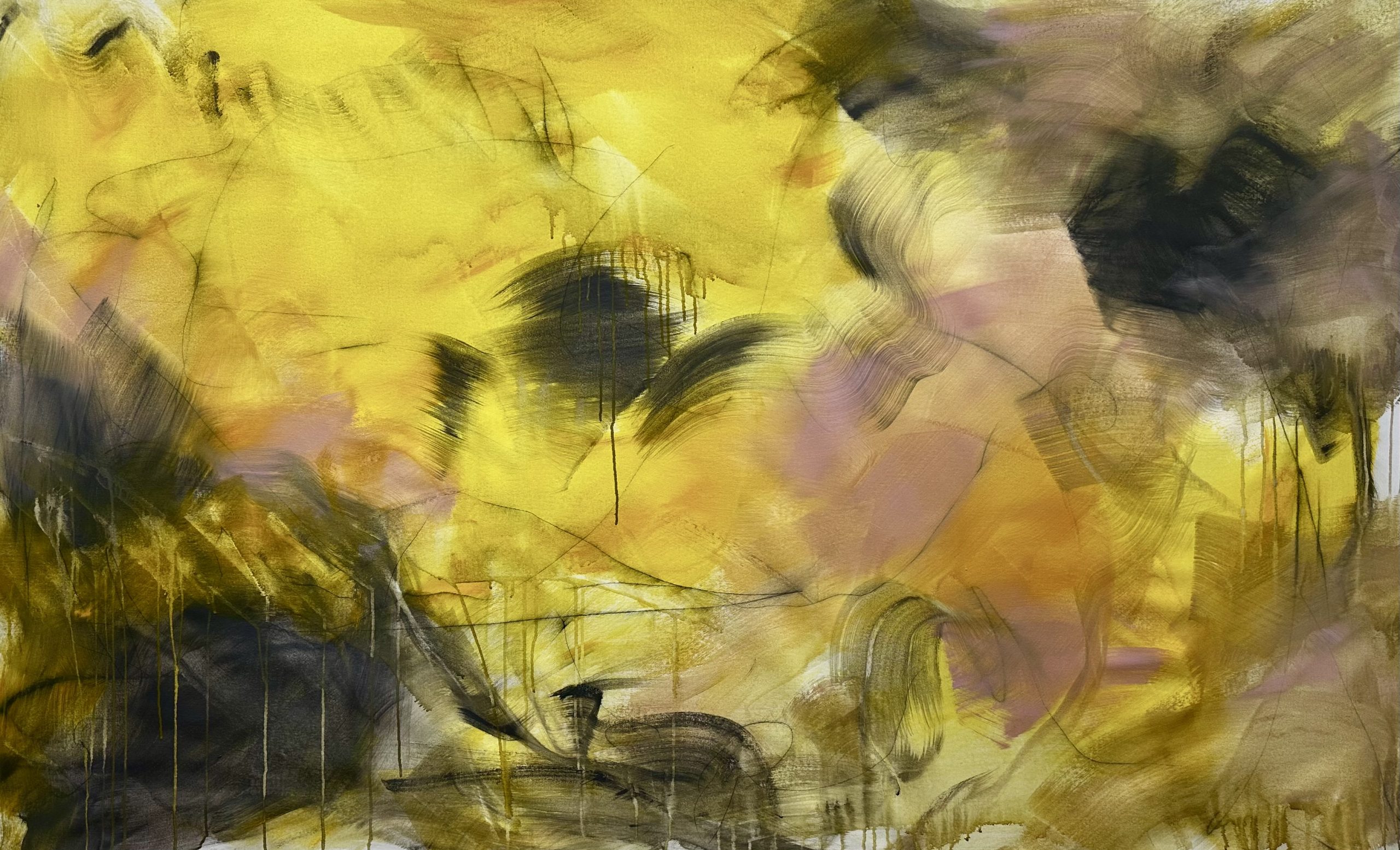 This artwork has broad luscious strokes in shades of warm yellow, grey and soft pink.