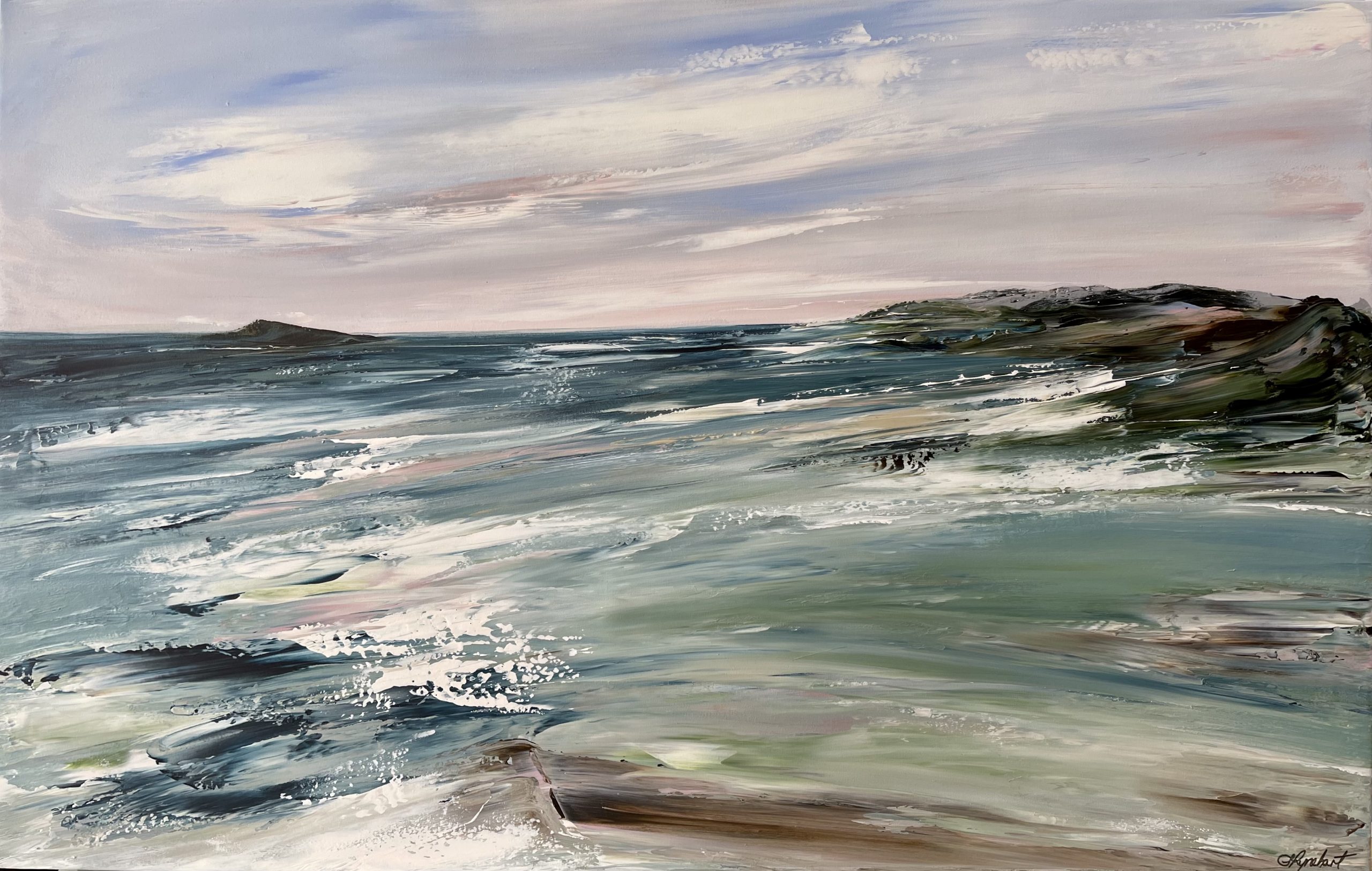 This statement artwork is created with palette knives on artist quality stretched canvas, and is satin varnished and comes with a COA. The painting has colour matched painted sides if you choose to purchase it unframed, or add an oak frame option for $300…get in touch before purchasing.