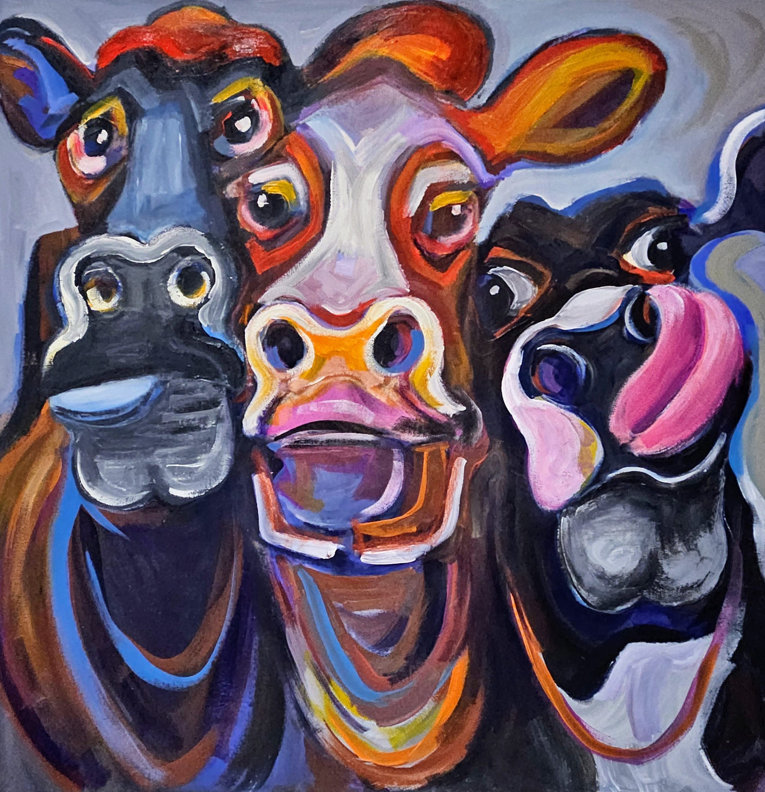 Narrative cows. Bold bright colours used to capture the personalities. Will enhance any wall in your home or office.