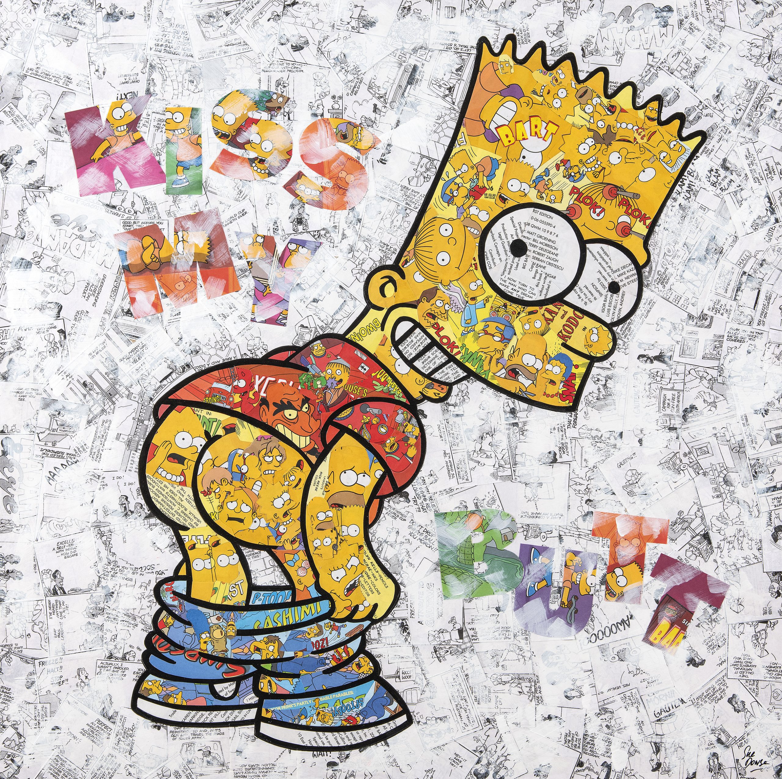 This colourful collage showcases Bart Simpson bending over, pants around his ankles, displaying his cheeky butt. Crafted exclusively from Simpson comic books, the artwork cleverly incorporates various Simpson characters to form Bart’s face and clothing. The background features black and white comics, with a light white wash. Accentuating the cheekiness, the words ‘Kiss My Butt’ playfully grace the collage, evoking a sense of playful rebellion and humor.